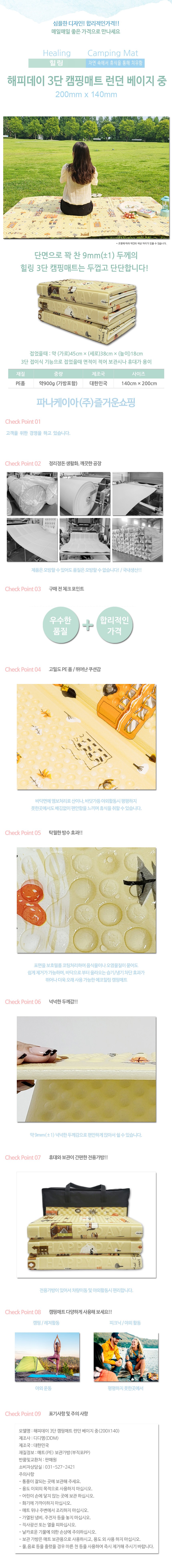 | 품명 및 모델명 | 해피데이 3단 캠핑매트 런던 베이지 중 | KC 인증정보 | 해당없음 |