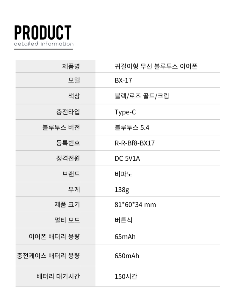| 품명 및 모델명 | 비파노 귀걸이형 무선 블루투스 이어폰 충전 케이스포함 BX-17 | KC 인증정보 | R-R-Bf8-BX17 |