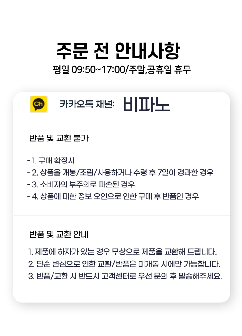 - ㆍ교환/반품에 관한 일반적인 사항은 판매자가 제시사항보다 관계법령이 우선합니다.