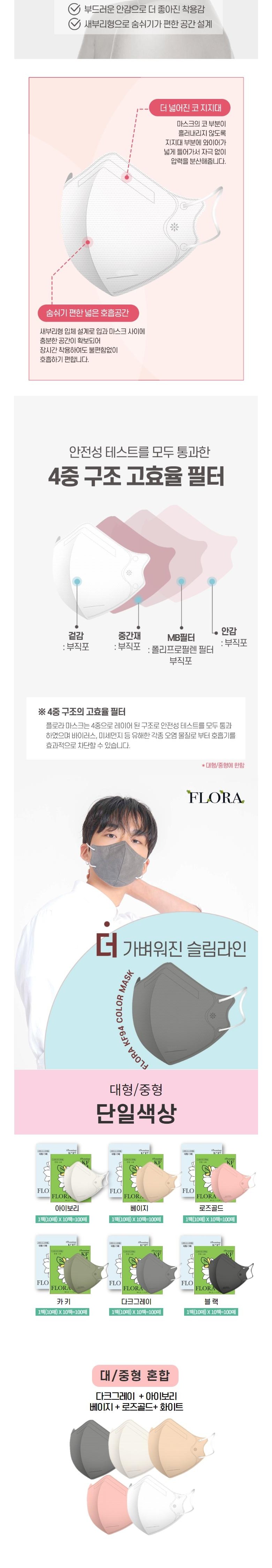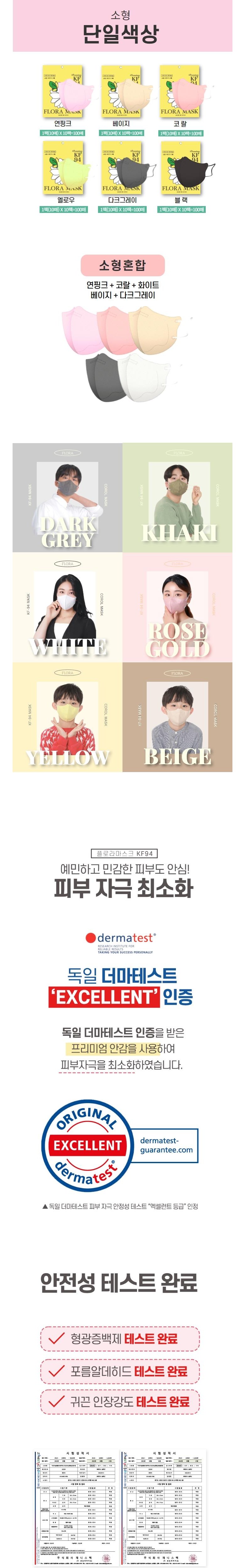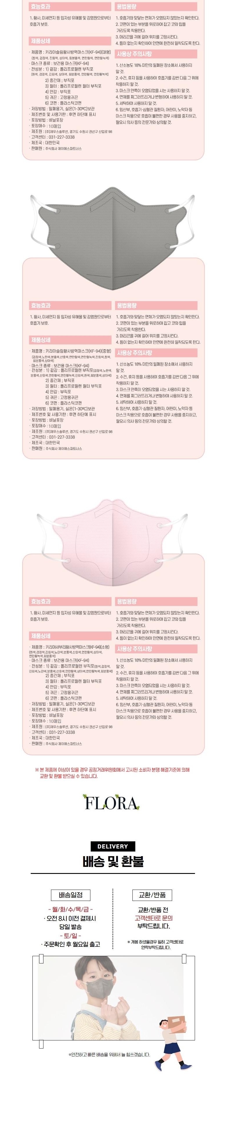 | 품명 및 모델명 | 플로라마스크키리아슬림황사방역마스크(KF-94)(대형, 중형)(흰색, 검정색, 진회색, 연한황색, 회분홍색, 상아색), 키리아새부리황사방역마스크(KF-94)(소형)(흰색, 검정색, 진회색, 연한황색, 분홍색, 산호색) | 인증/허가 사항 | 의약외품 |