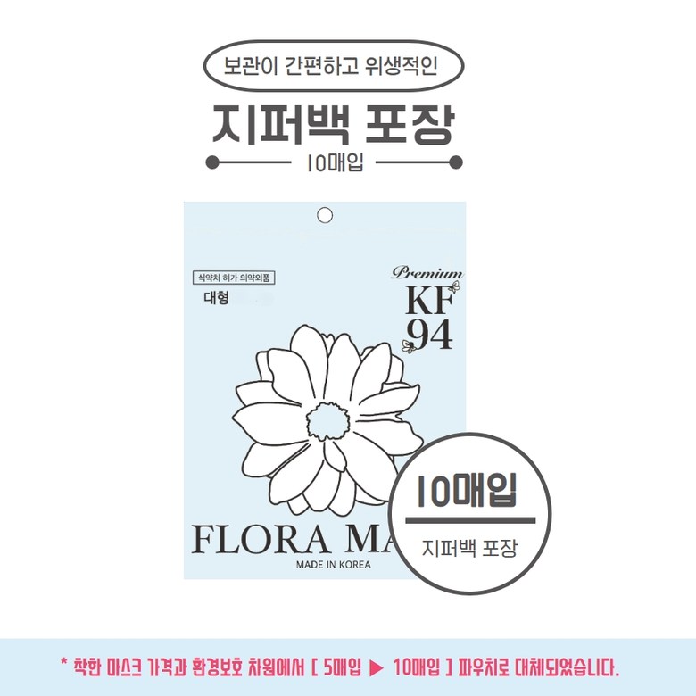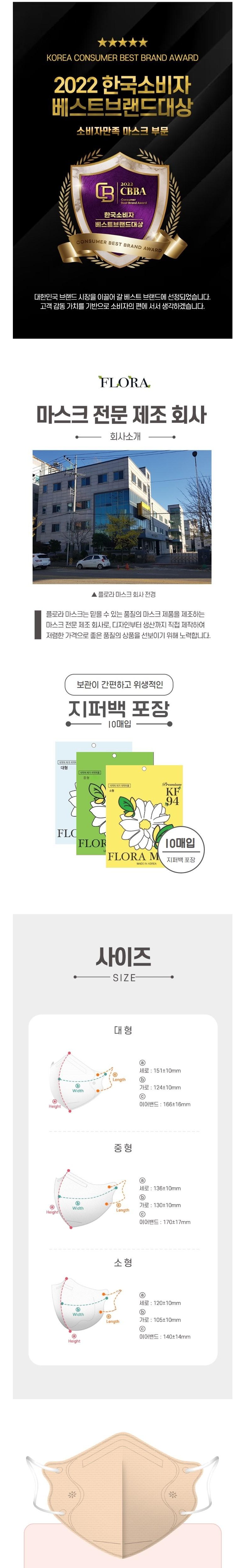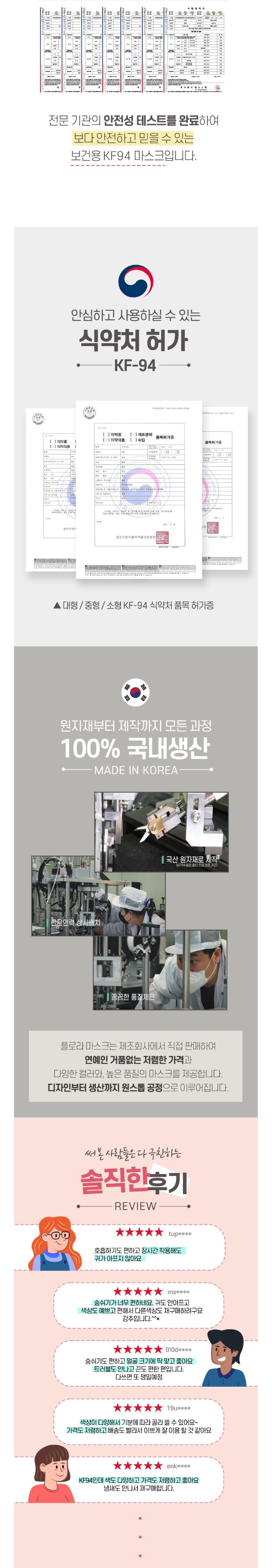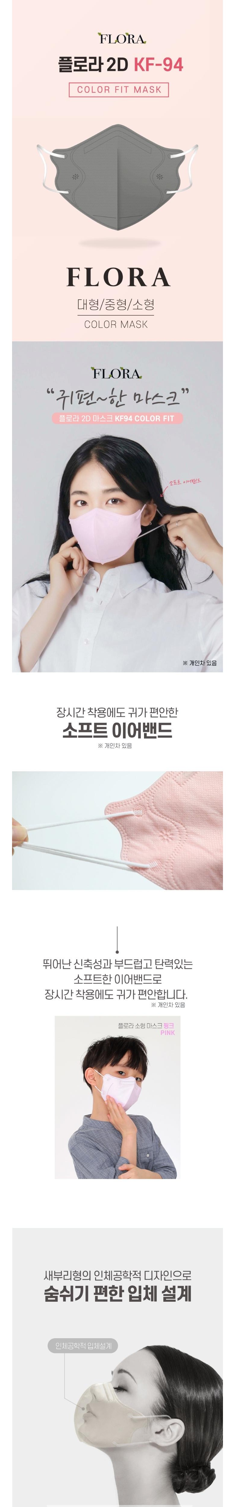 | 품명 및 모델명 | 플로라마스크키리아슬림황사방역마스크(KF-94)(대형, 중형)(흰색, 검정색, 진회색, 연한황색, 회분홍색, 상아색), 키리아새부리황사방역마스크(KF-94)(소형)(흰색, 검정색, 진회색, 연한황색, 분홍색, 산호색) | 인증/허가 사항 | 의약외품 |