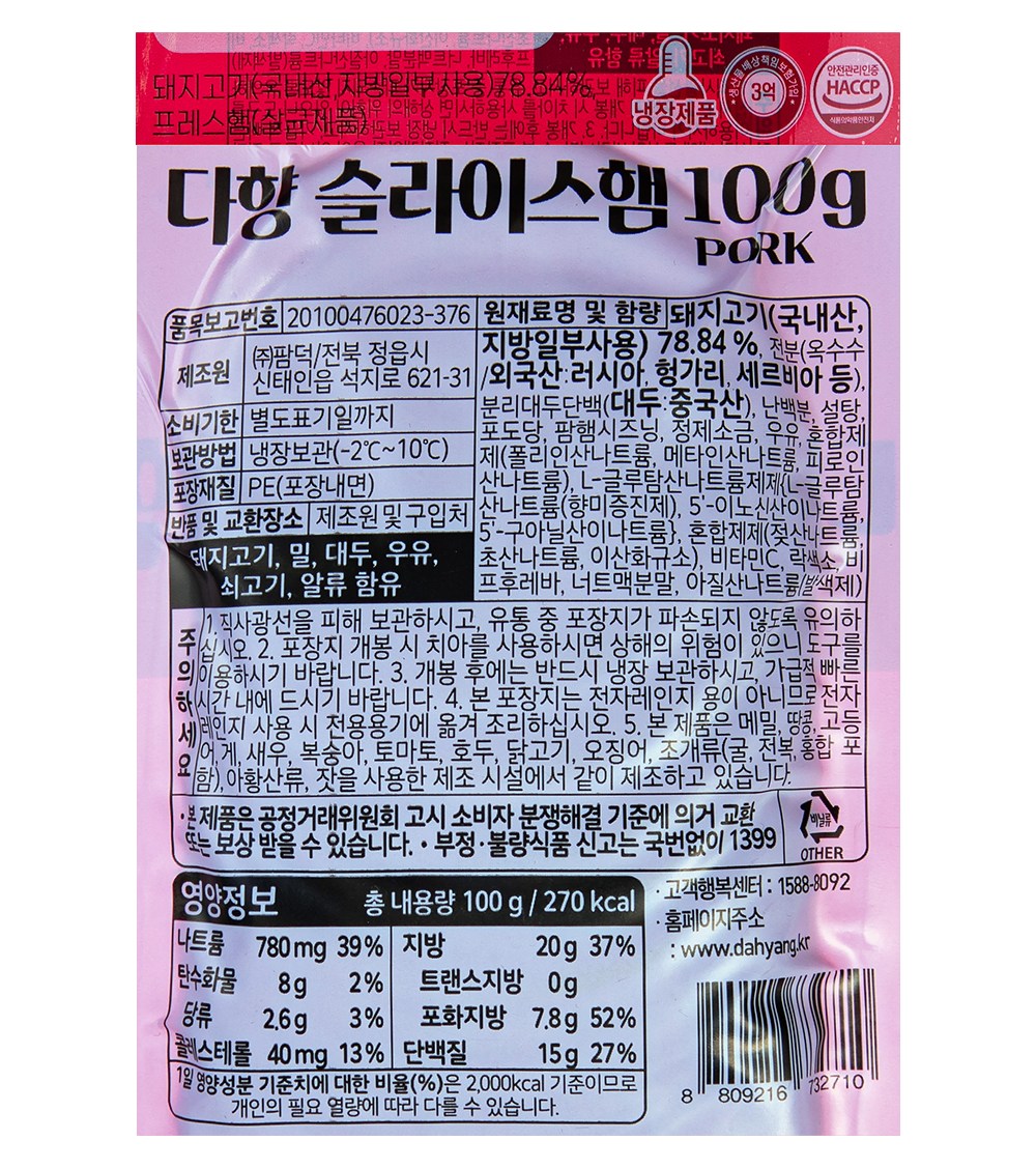 | 제품명 | 다향 슬라이스햄 pork | 식품의 유형 | 프레스햄 |