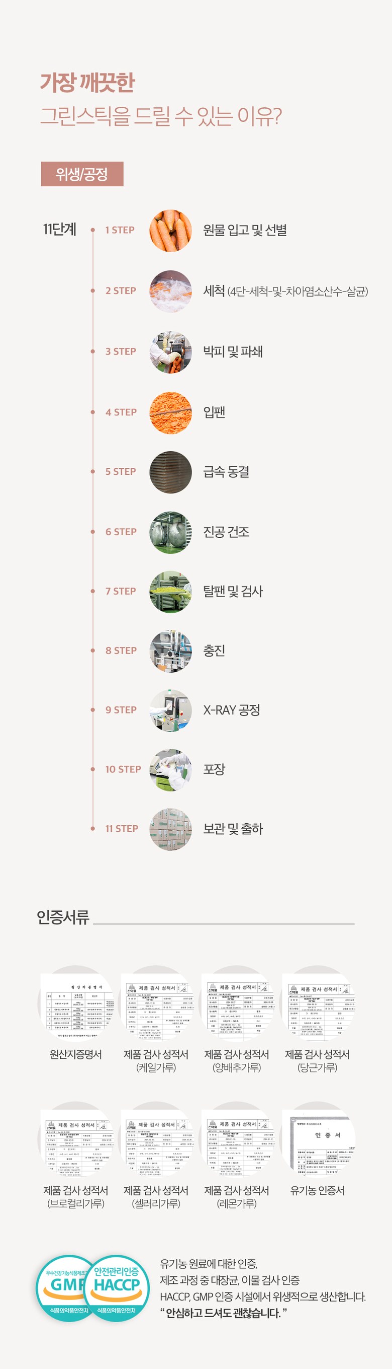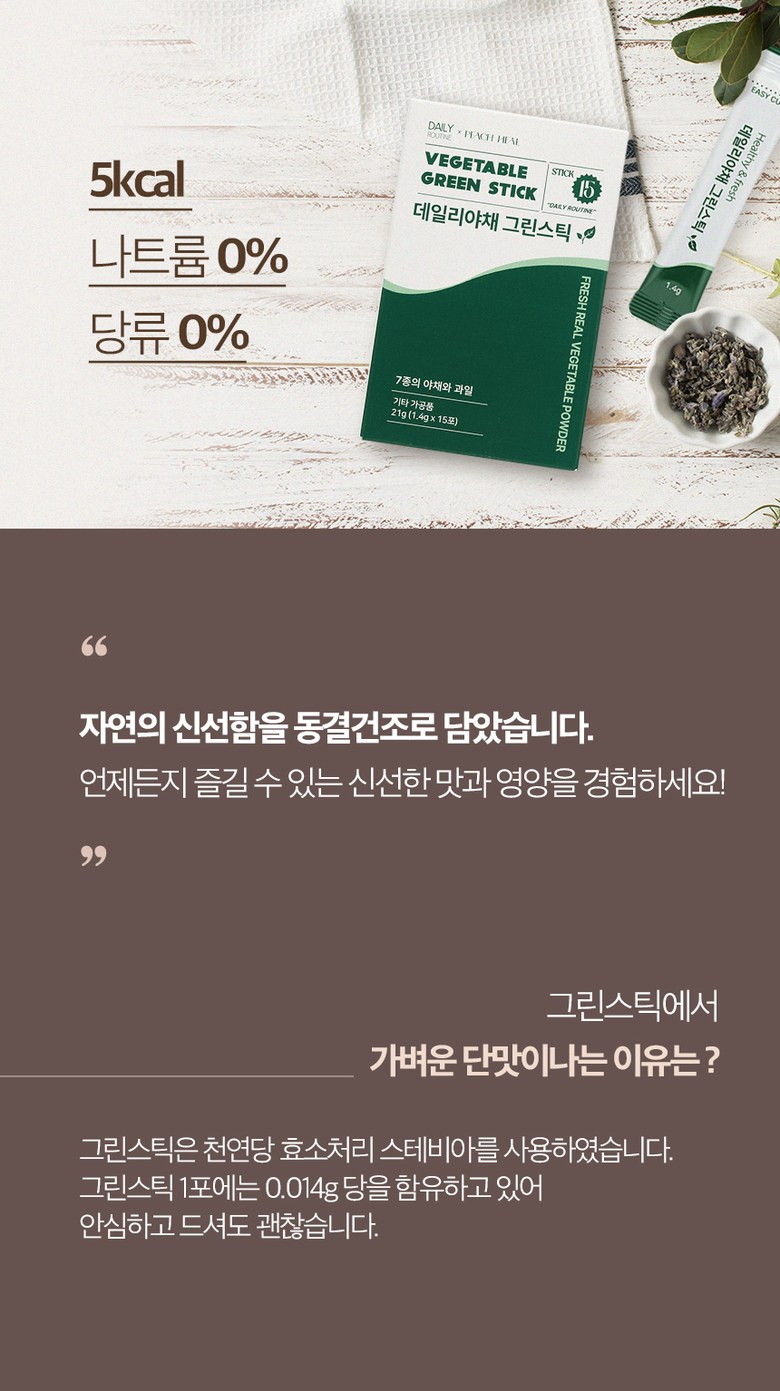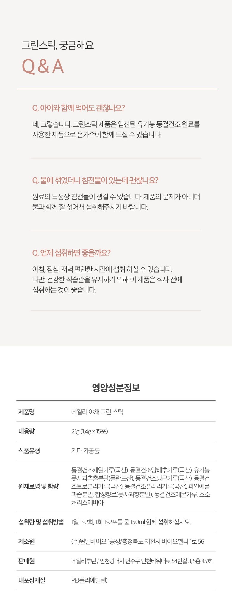 | 품목 또는 명칭 | 데일리야채 그린스틱 | 포장단위별 내용물의 용량(중량),수량,크기 | 총 내용량 21g(1.4g x 15포) |