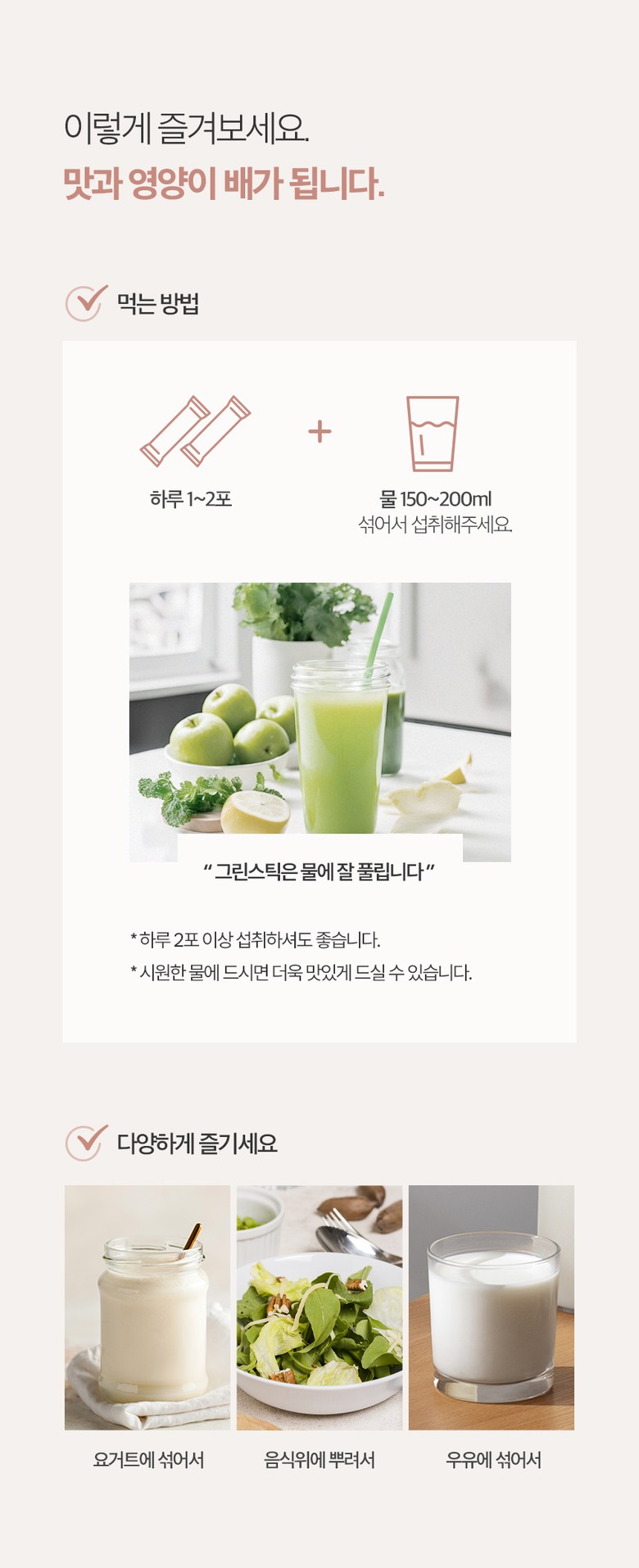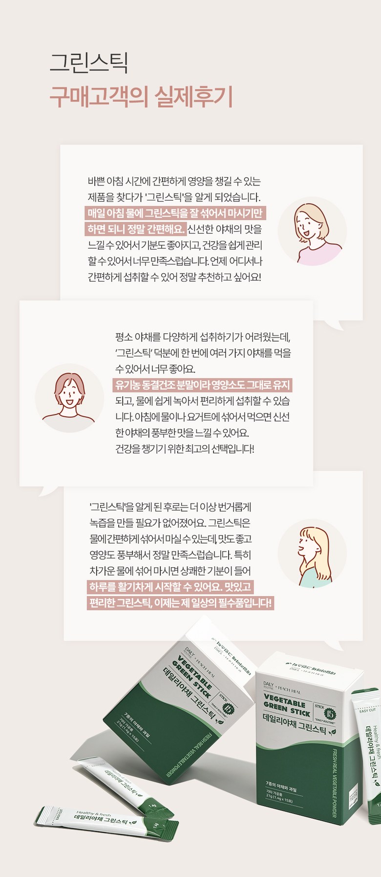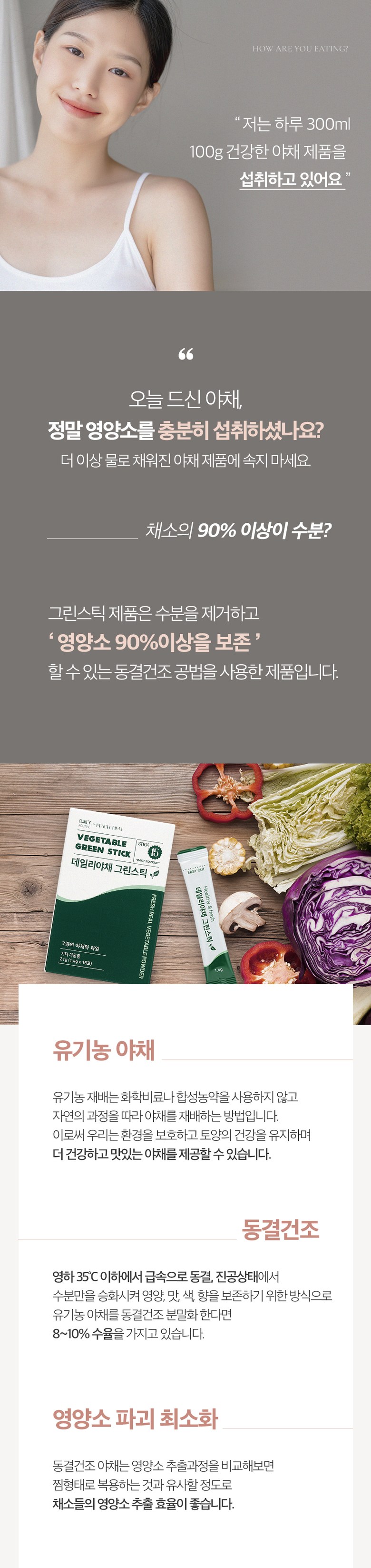 | 품목 또는 명칭 | 데일리야채 그린스틱 | 포장단위별 내용물의 용량(중량),수량,크기 | 총 내용량 21g(1.4g x 15포) |