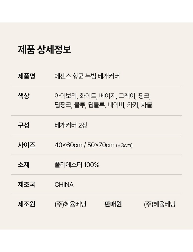 | 제조자(수입자) | 주식회사 혜윰베딩 | 제조국 | 중국 |