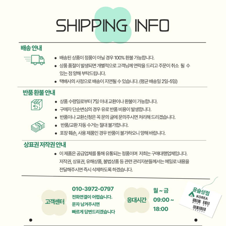 | 배송방법 | 순차배송 | 배송비 | 3,000원 - 도서산간 지역 배송불가 |