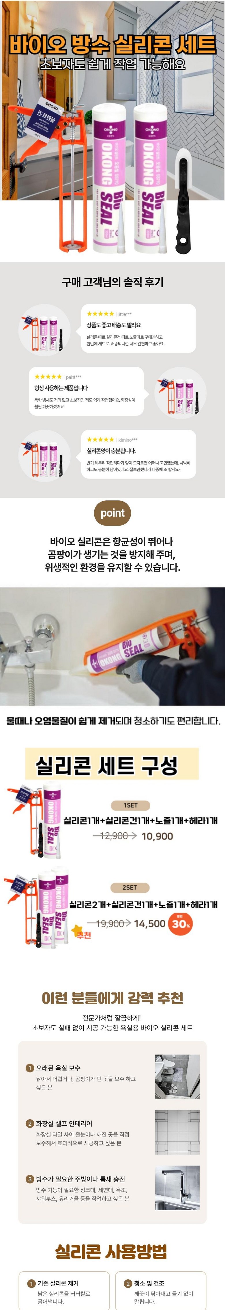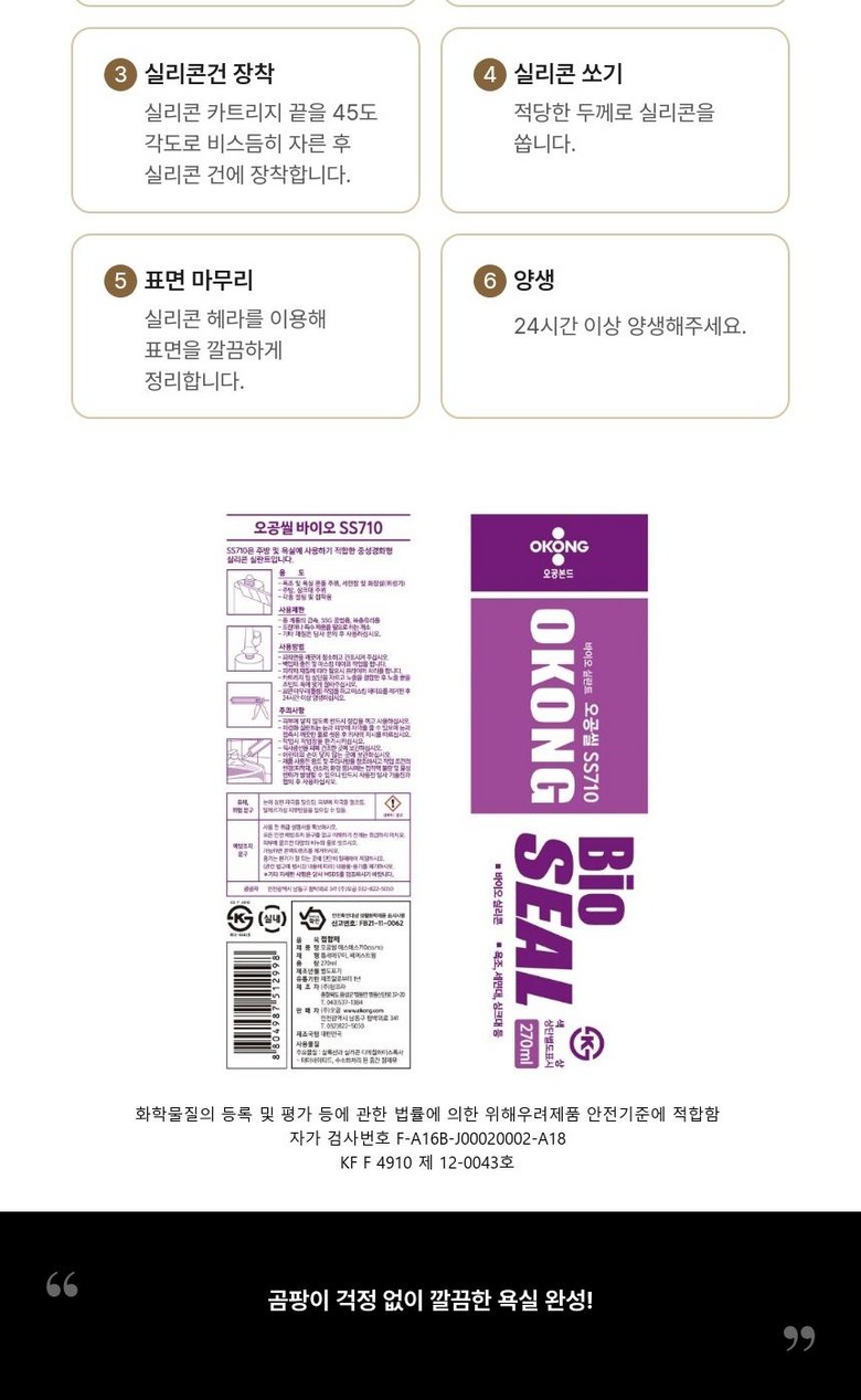 | 품목 및 제품명 | 오공 ss710 바이오 실리콘 | 용도(표백제의 경우 계열을 함께표시) 및 제형 | 욕조 및 욕실 문틀 주위, 세면장 및 화장실 틈새 메꾸미, 페이스트형 |