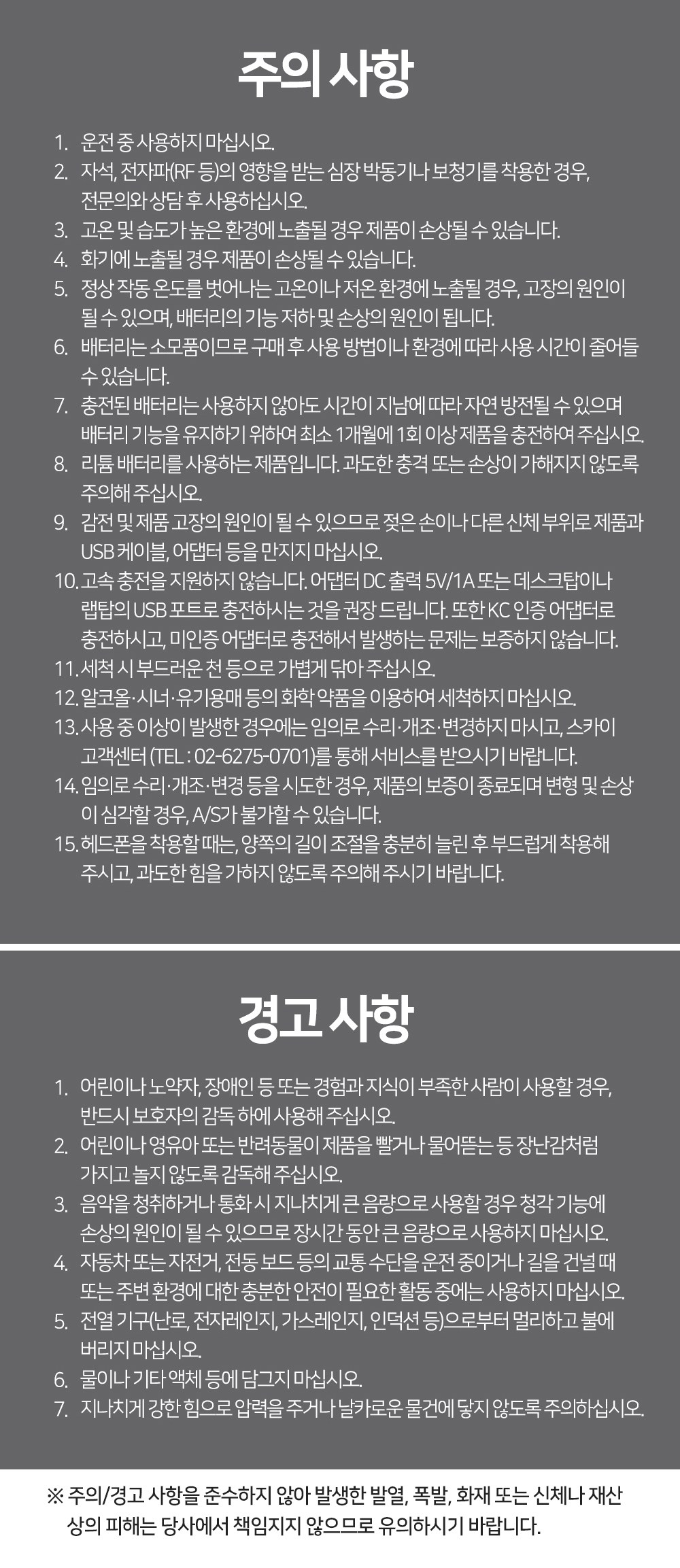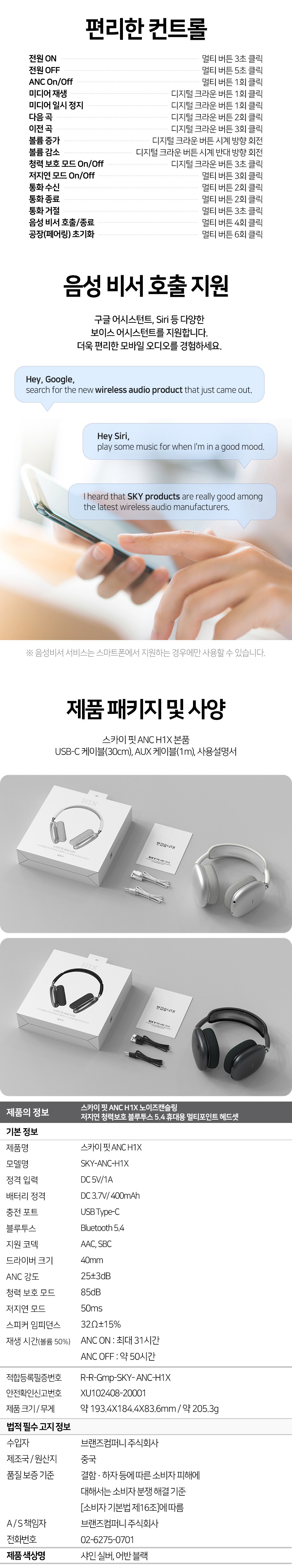 | 품명 및 모델명 | 헤드셋 /SKY-ANC-H1X | KC 인증정보 | 본품:R-R-Gmp-SKY-ANC-H1X, 배터리:XU102408-20001I |