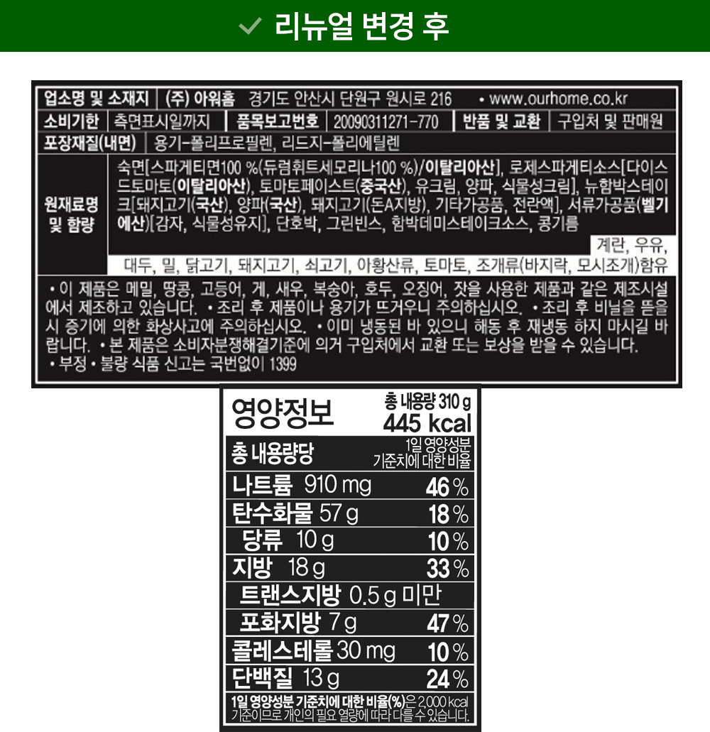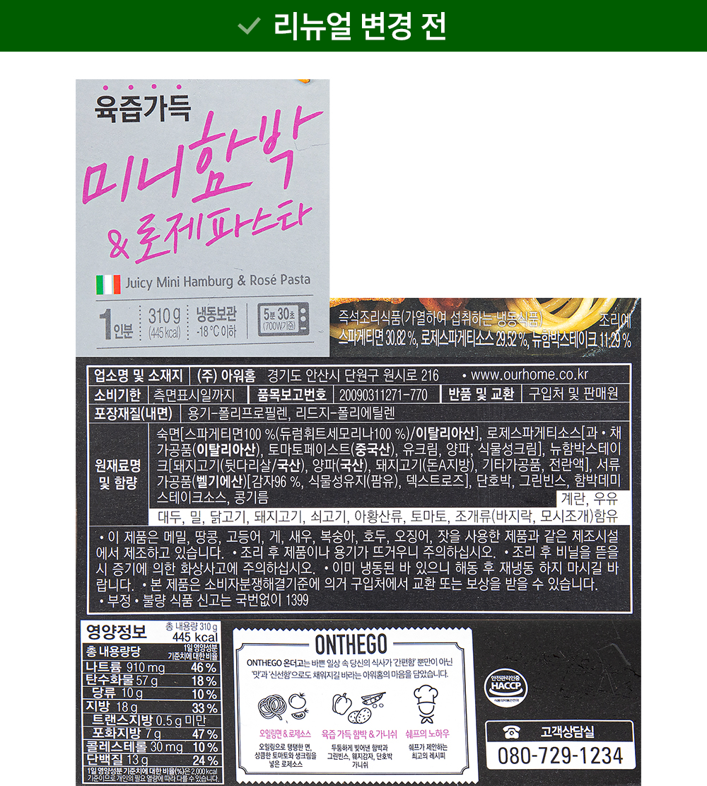 | 제품명 | 육즙가득 미니함박&로제파스타 | 식품의 유형 | 즉석조리식품 |