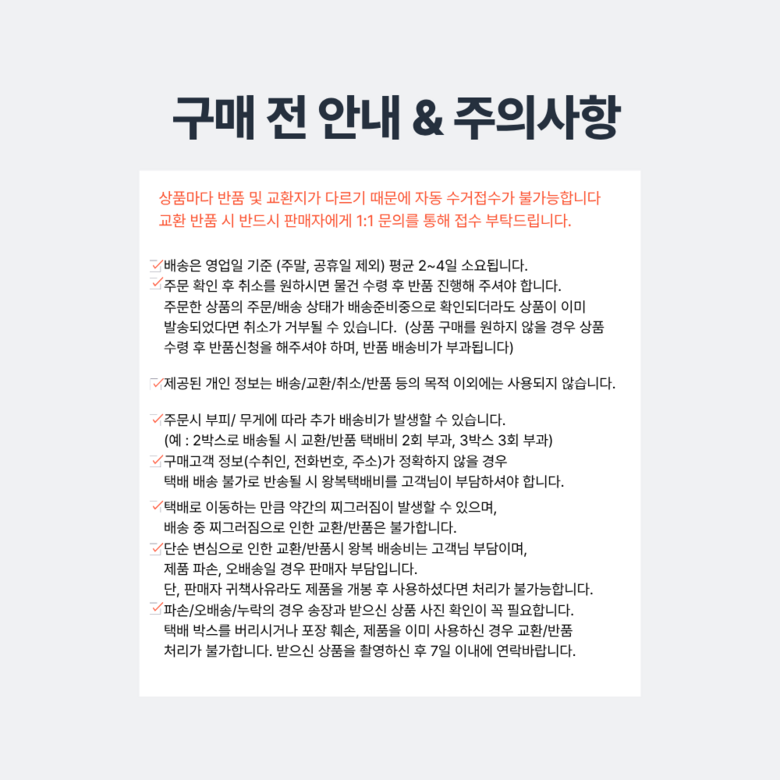 | 교환/반품 비용 (왕복비용) | 10,000원 - 단, 고객 변심의 경우에만 발생 - 도서산간 지역 배송불가 |