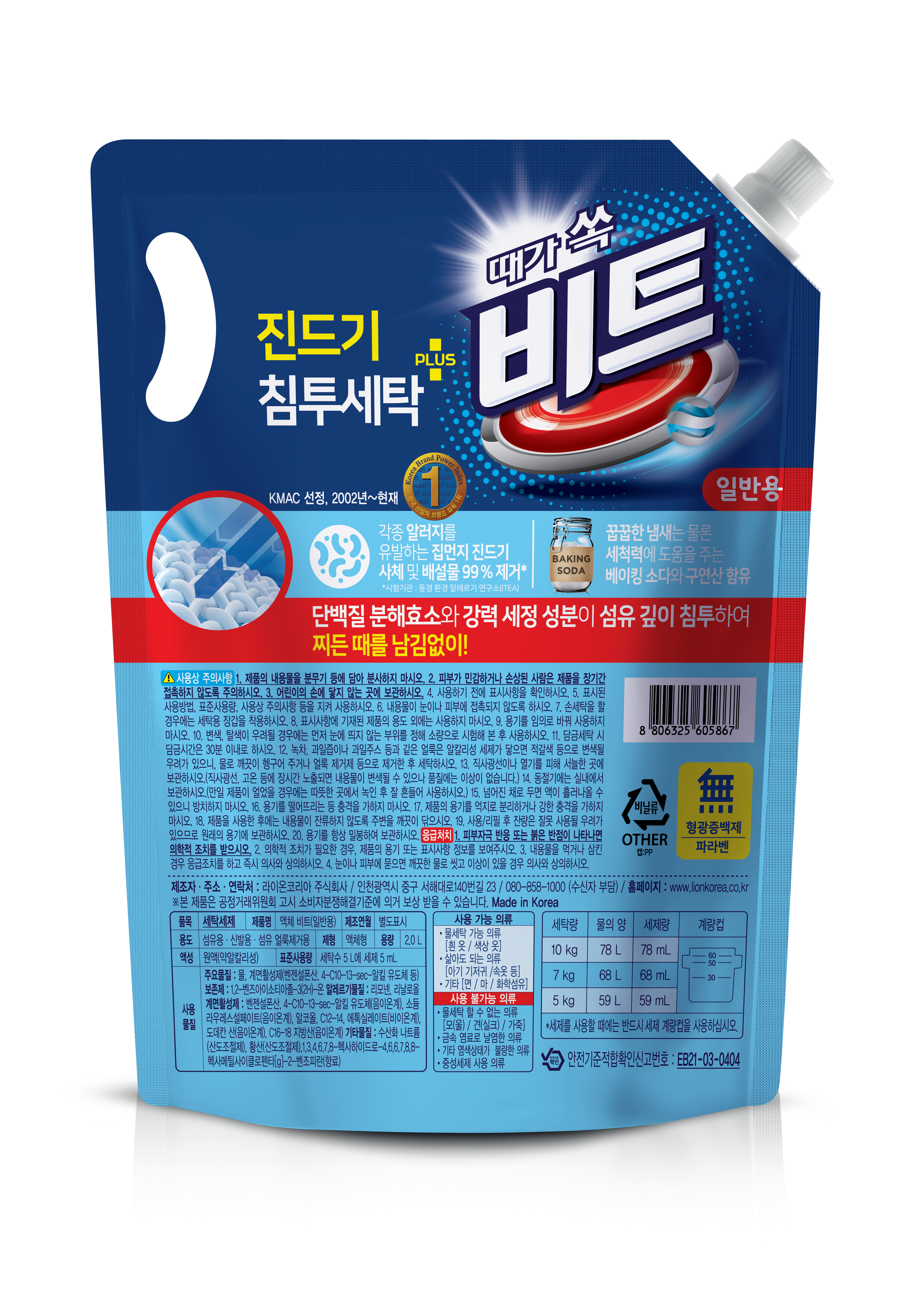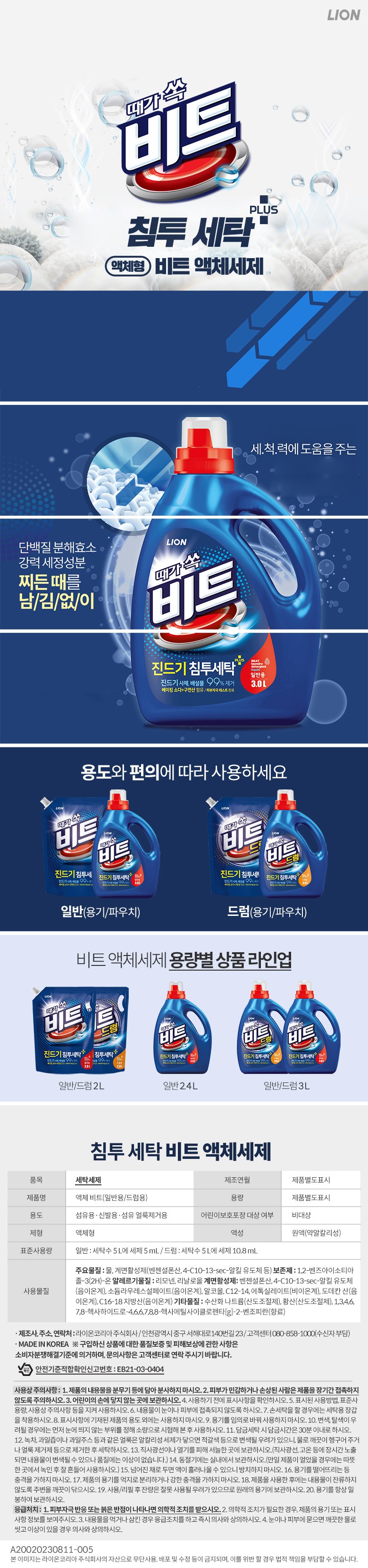| 품목 및 제품명 | 세탁세제/액체 비트(일반용) | 용도(표백제의 경우 계열을 함께표시) 및 제형 | 섬유용, 신발용, 섬유 얼룩제거용/액체형 |