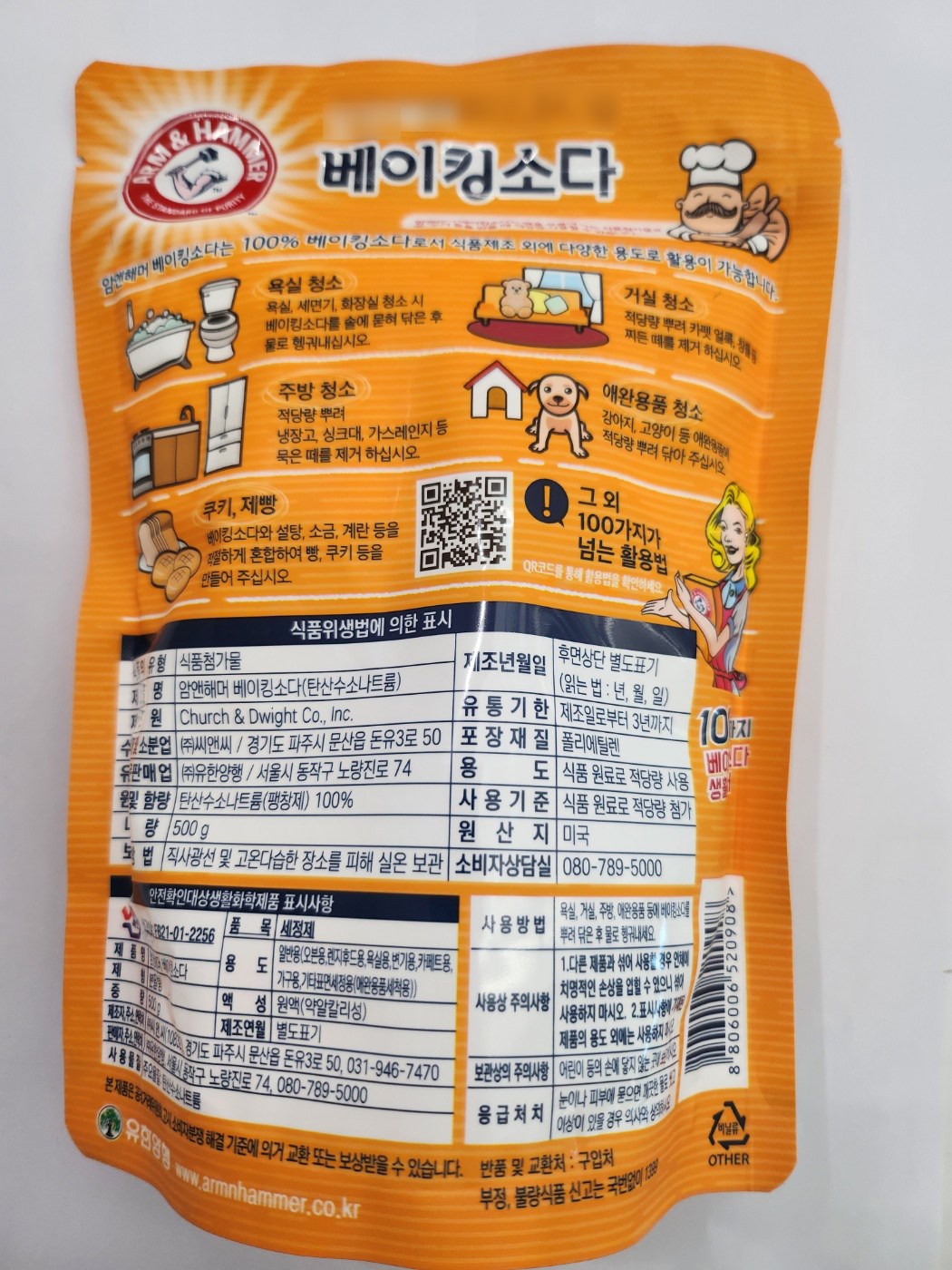 | 품목 및 제품명 | 세정제 / 암앤해머베이킹소다 | 용도(표백제의 경우 계열을 함께표시) 및 제형 | 일반용-오븐용,일반용-렌지후드용,일반용-욕실용,일반용-변기용,일반용-카페트용,일반용-가구용,일반용-기타표면세정용-애완용품세척용 / 분말형 |