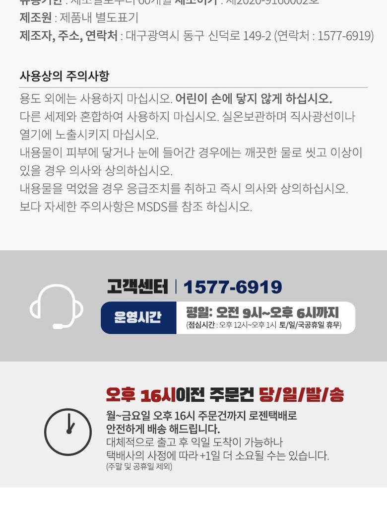 | 교환/반품 비용 (왕복비용) | 6,000원 - 단, 고객 변심의 경우에만 발생 - 도서산간 지역 배송불가 |