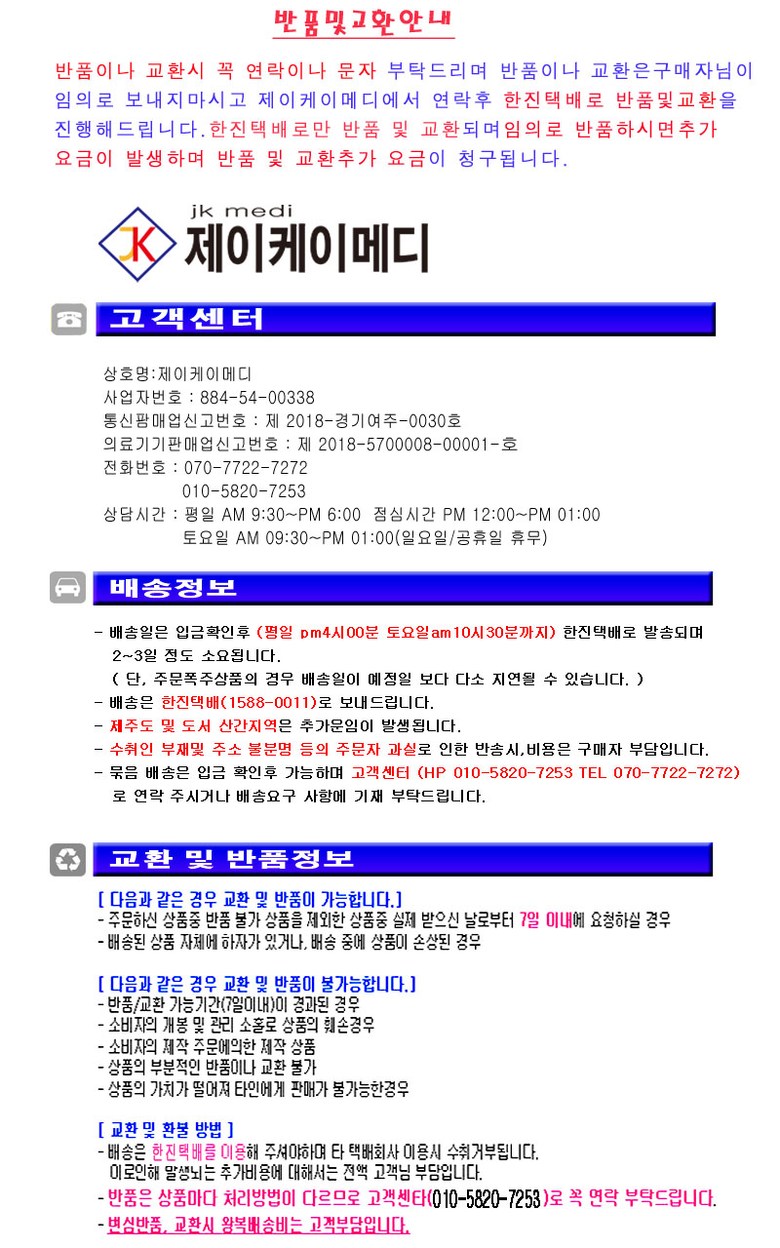 | 교환/반품 신청 기준일 | ㆍ단순변심에 의한 교환/반품은 제품 수령 후 7일 이내까지, 교환/반품 제한사항에 해당하지 않는 경우에만 가능 (배송비용과 교환/반품 비용 왕복배송비 고객부담) ㆍ상품의 내용이 표시·광고의 내용과 다른 경우에는 상품을 수령한 날부터 3개월 이내, 그 사실을 안 날 또는 알 수 있었던 날부터 |