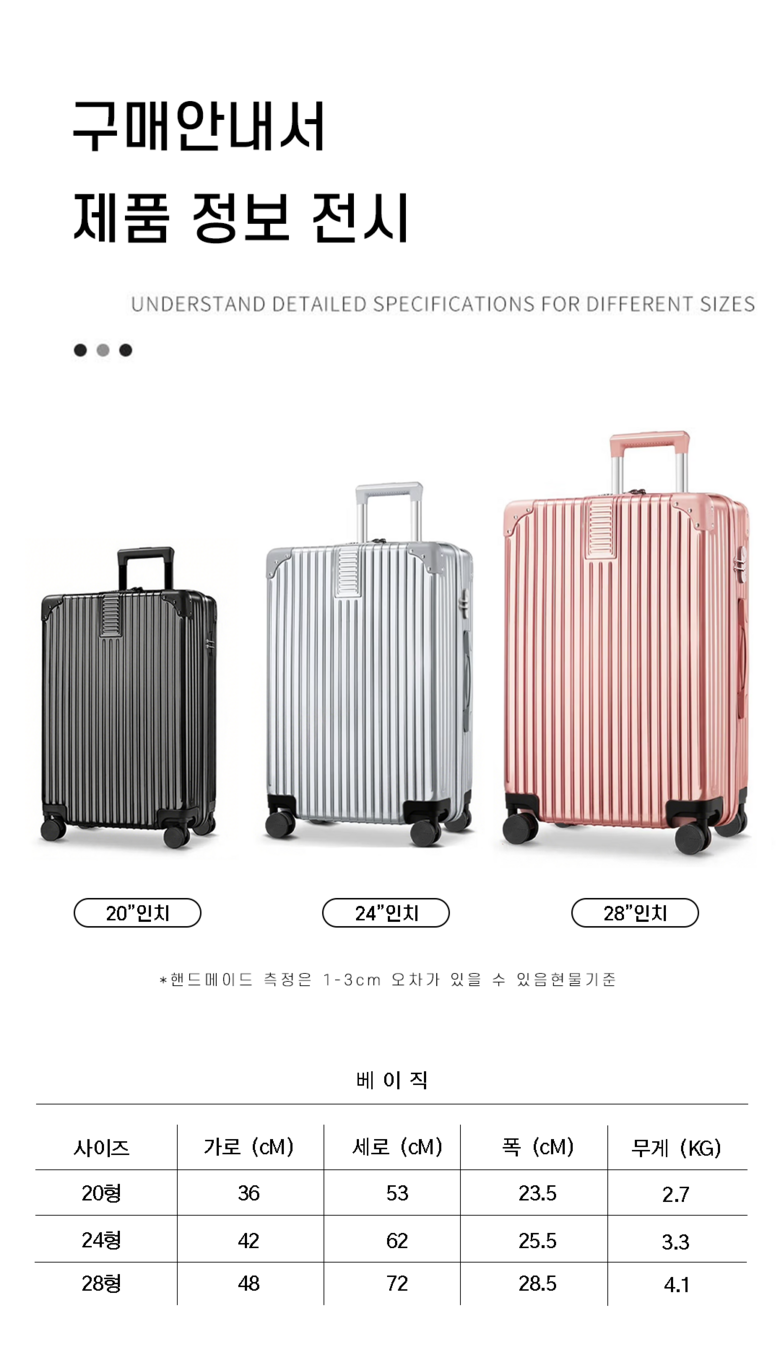 | 색상 | 녹색,로즈골드,실버,블랙 | 크기 | 20인치:36*23*53CM---2.6KG24인치:42*25*62CM---3.2KG28인치:48*28*72CM---4.1KG |