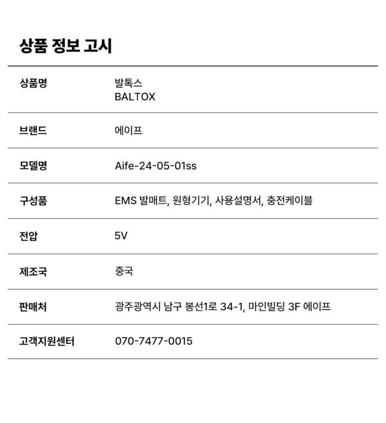 | 품명 및 모델명 | 발톡스 EMS 발마사지기 | 인증/허가 사항 | 컨텐츠 내 참조 |