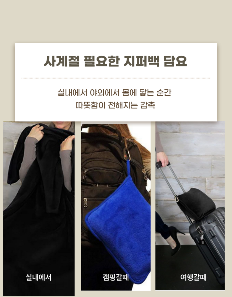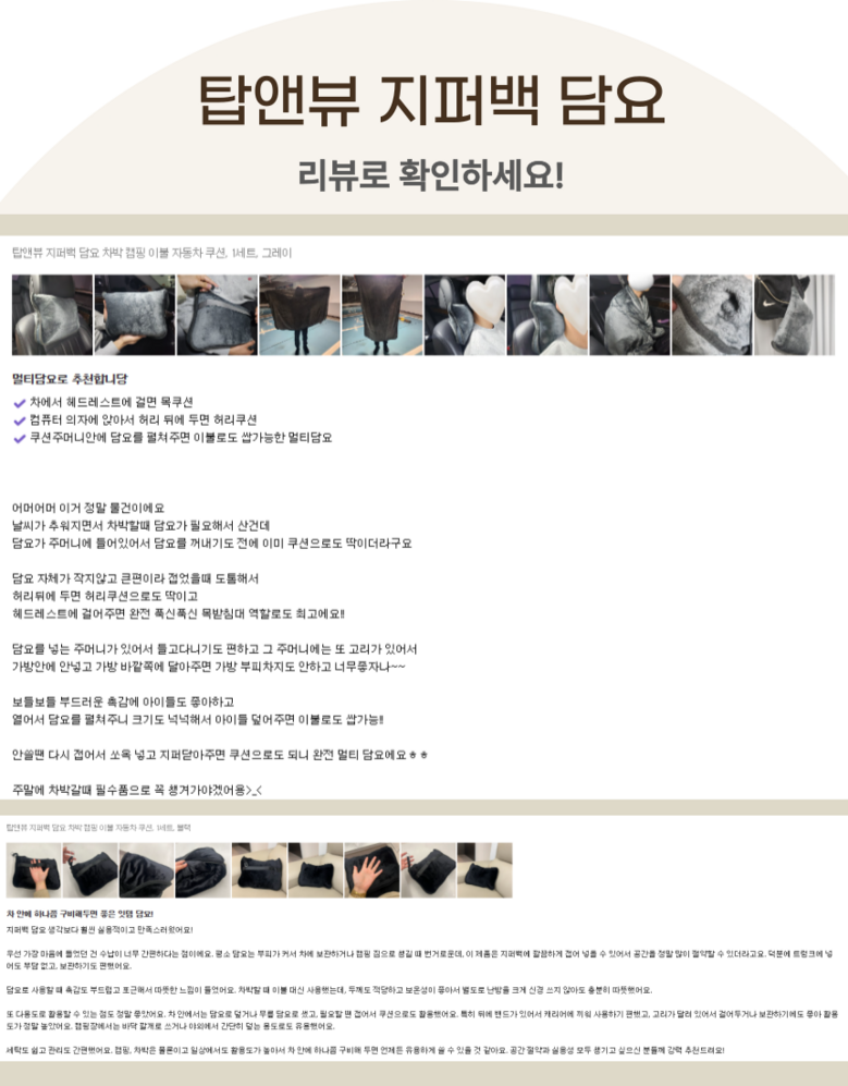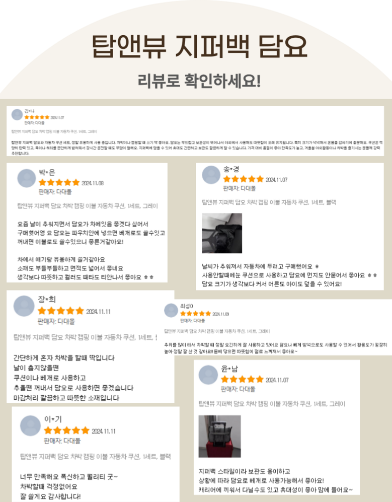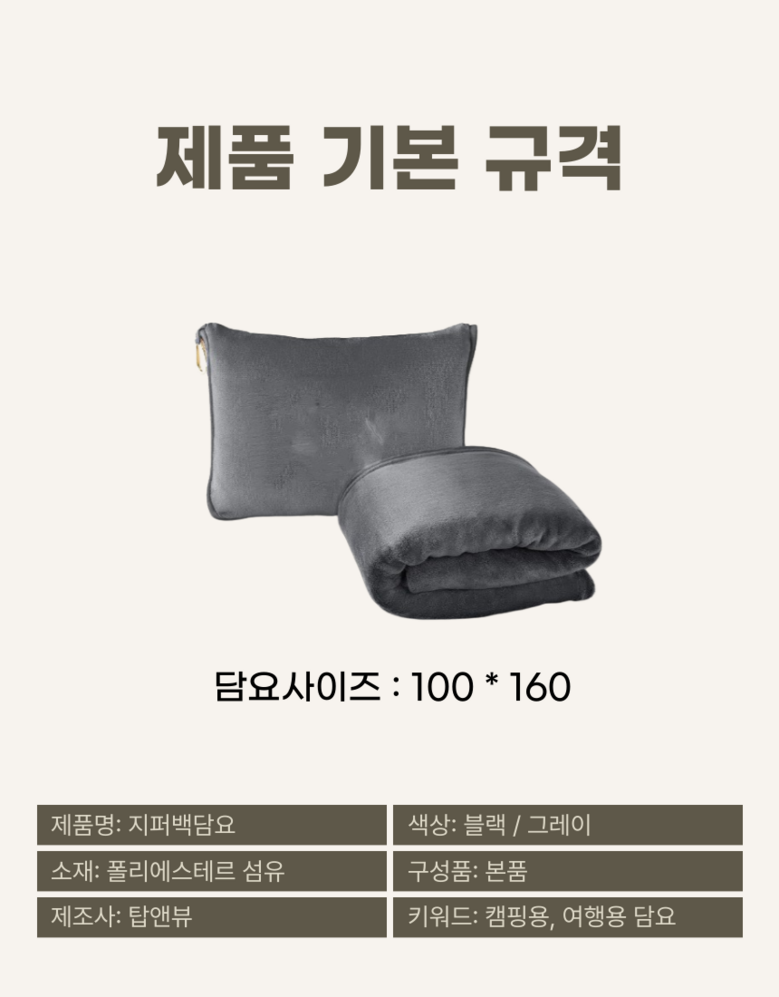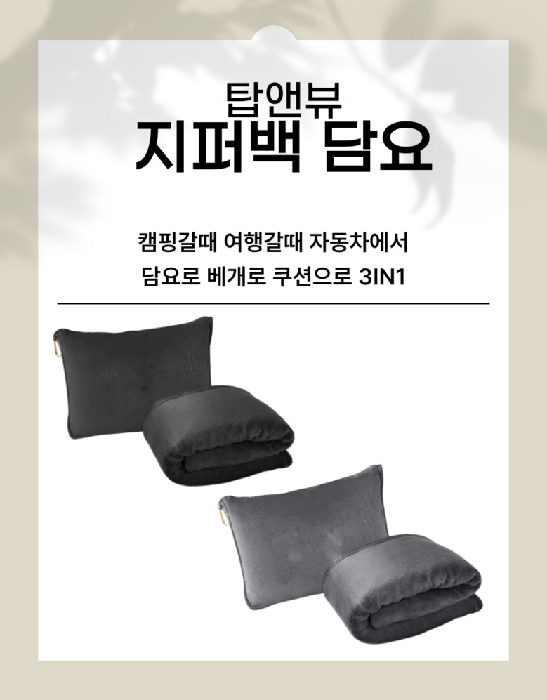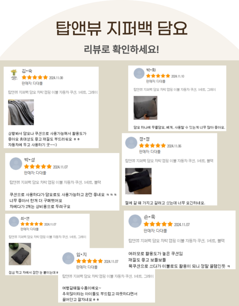 | 품명 및 모델명 | 탑앤뷰 지퍼백 담요 차박 캠핑 이불 자동차 쿠션 | 인증/허가 사항 | 해당사항없음 |