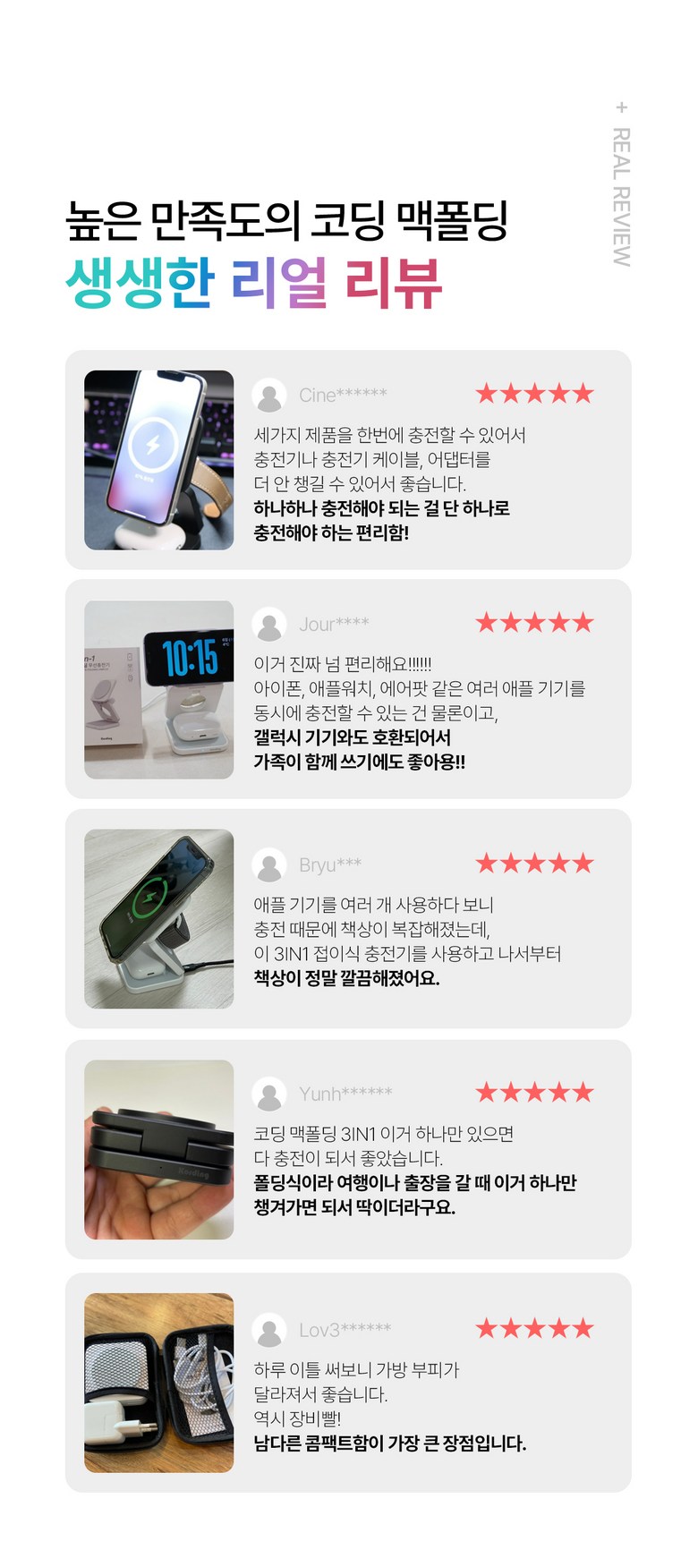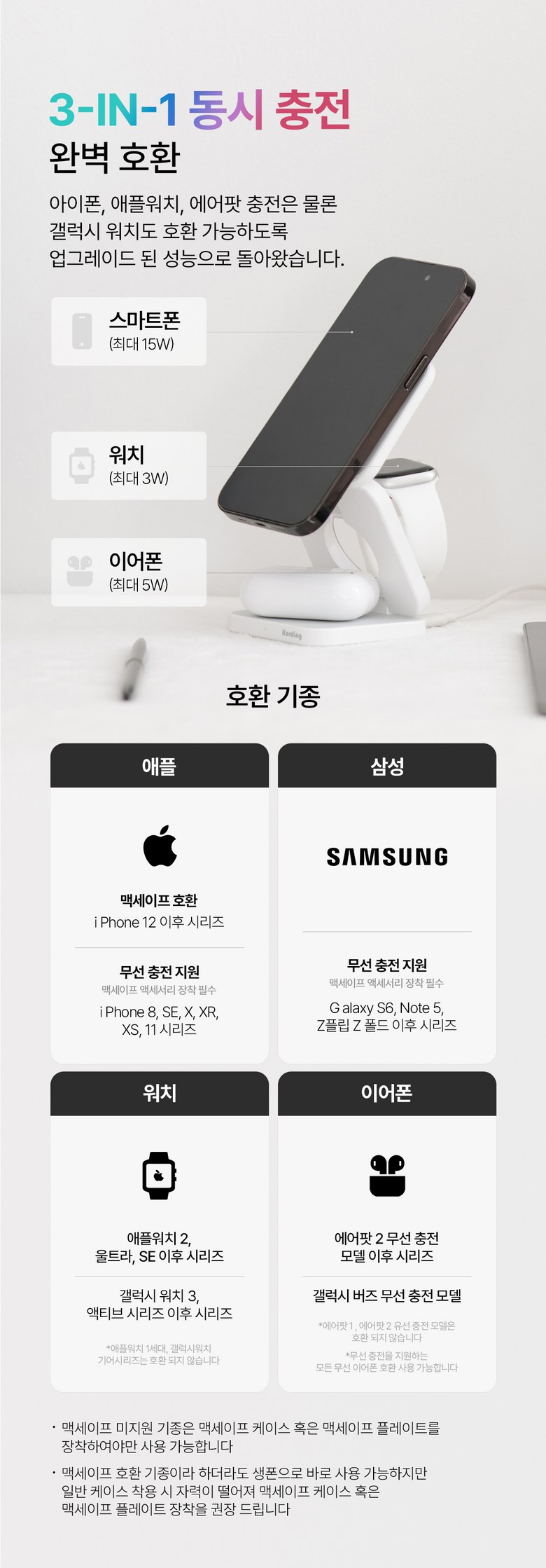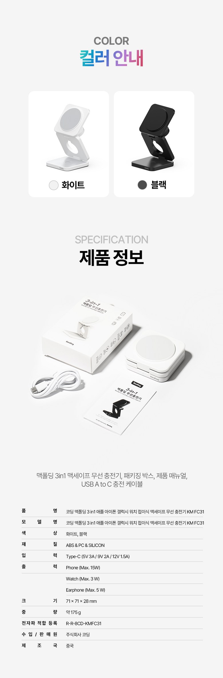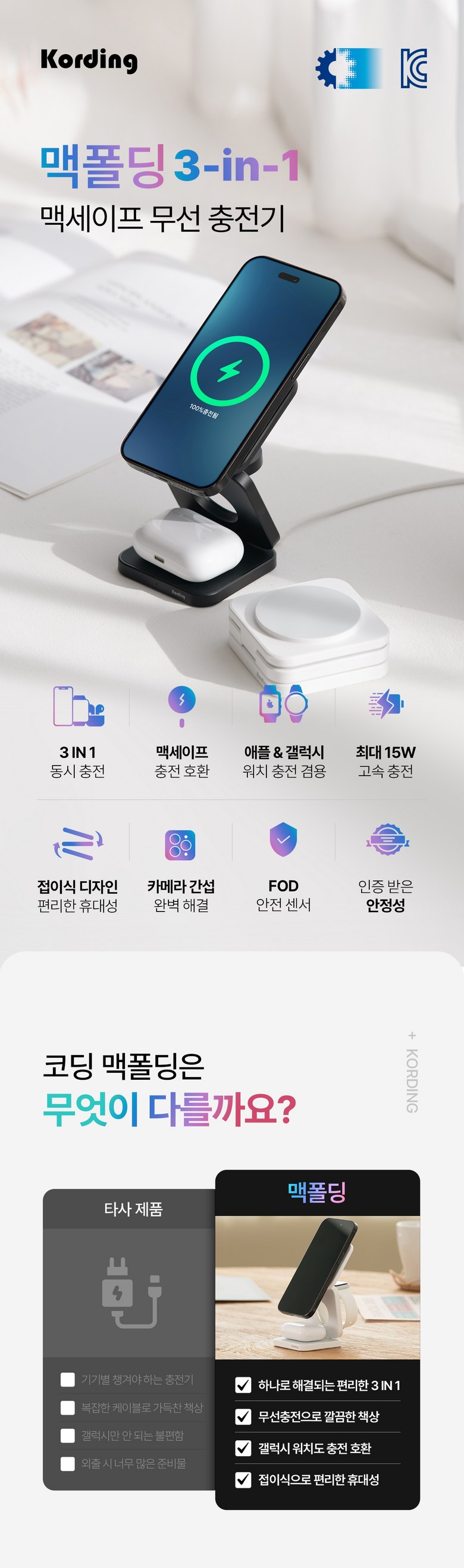| 품명 및 모델명 | 코딩 맥폴딩3in1 아이폰 애플 워치 갤럭시 호환 접이식 고속무선 맥세이프 충전기 KMFC31 | 인증/허가 사항 | 전자파적합등록: R-R-8CD-KMFC31 |