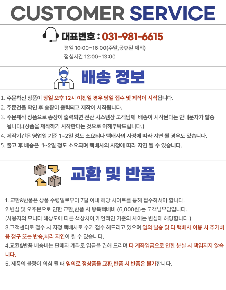 - ㆍ모니터 해상도의 차이로 인해 색상이나 이미지가 실제와 달라, 고객이 단순 변심으로 교환/반품을 무료로 요청하는 경우