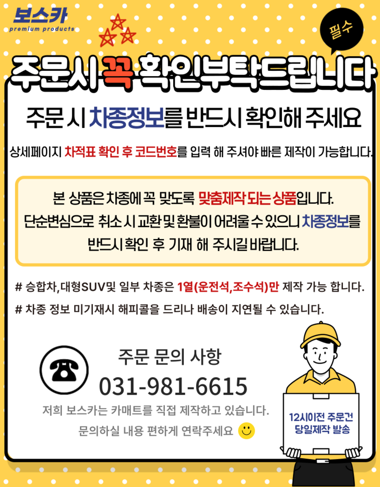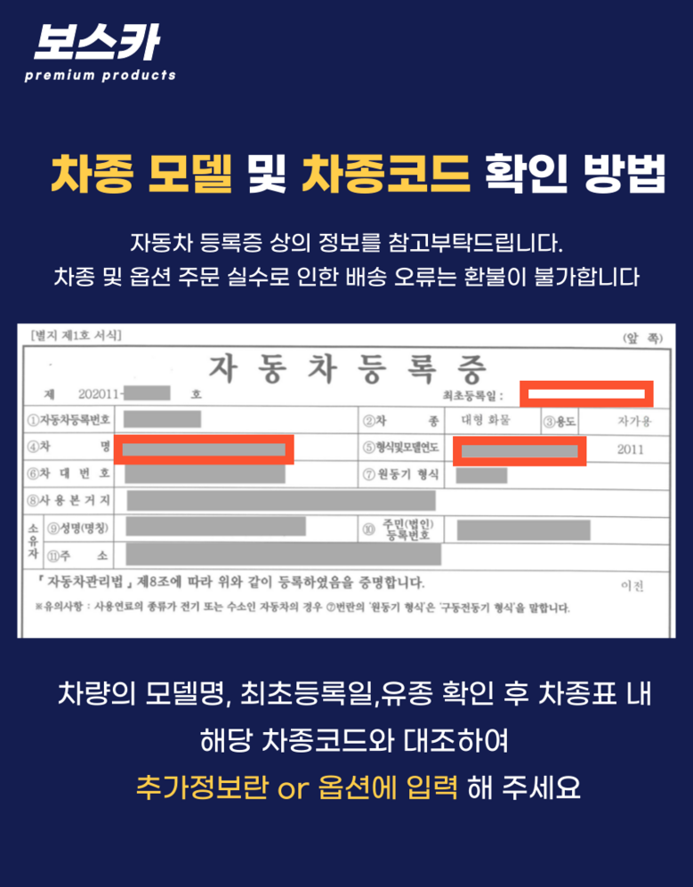 제품 결제넘어가기전 추가정보란에 차량 코드 기입해주시면 됩니다!