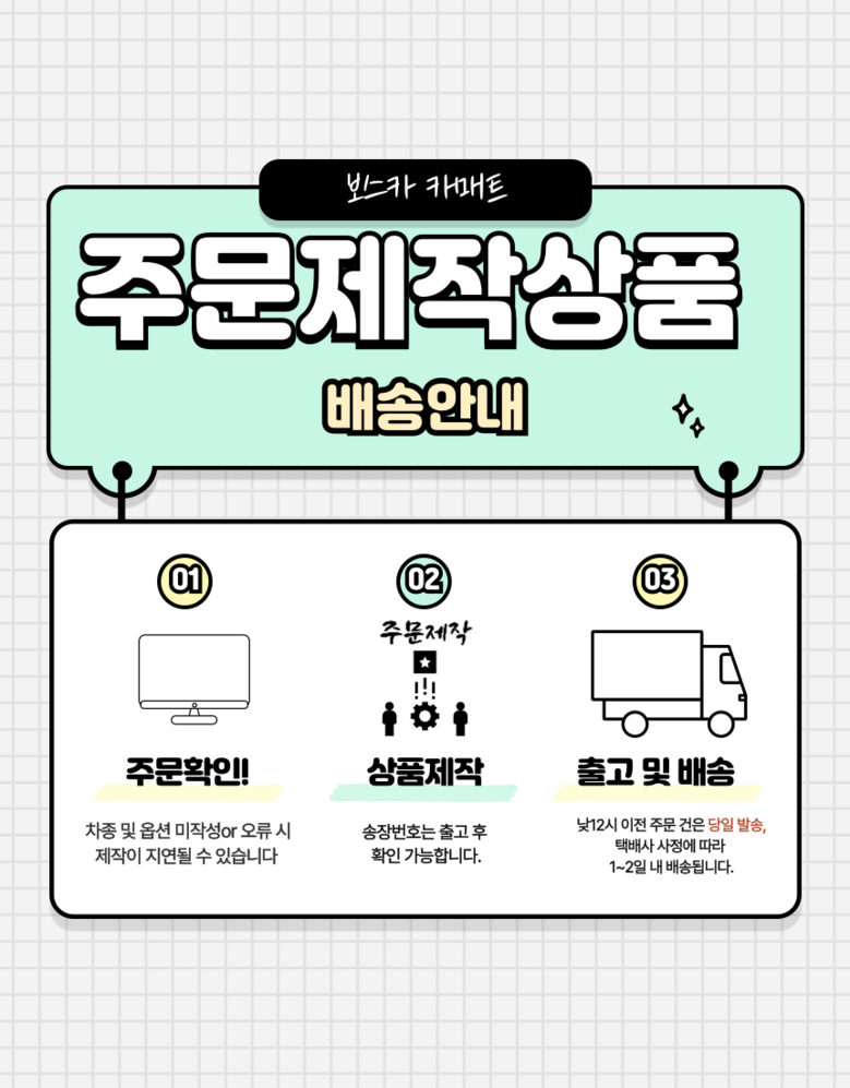 | 배송방법 | 주문제작 | 배송비 | 무료배송 · 도서산간 추가 배송비 - 제주 지역: 3,000원 - 도서산간 지역: 3,500원 |