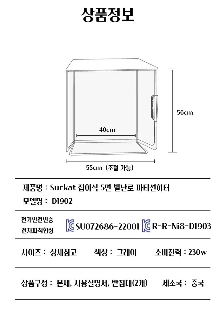 | 품명 및 모델명 | Surkat 접이식 5면 발난로 파티션히터 사무실 전기 발난로 온열기 | KC 인증정보 | SU072686-22001,R-R-Ni8-D1903 |