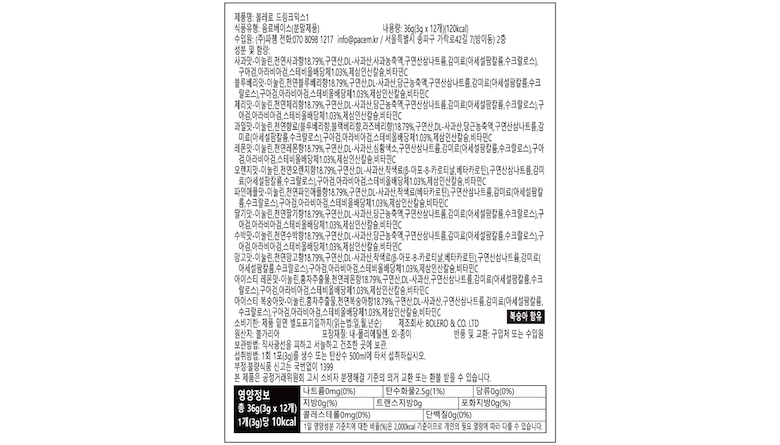 | 포장단위별 내용물의 용량(중량), 수량 | 3g X 12포 | 원재료명 및 함량 | 상품 상세페이지 참조 |