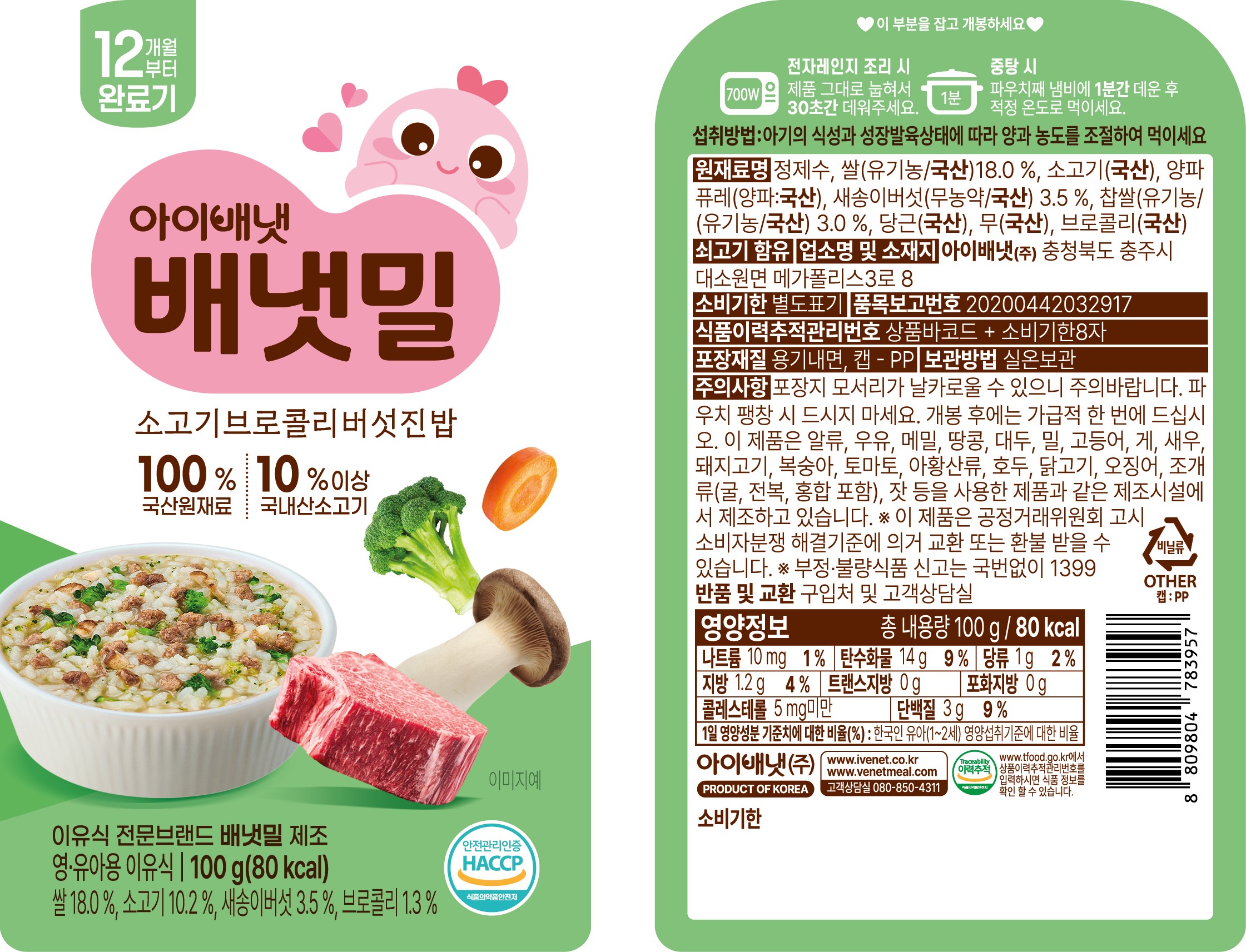 | 제품명 | 배냇밀 완료기 소고기브로콜리버섯진밥 | 식품의 유형 | 영·유아용 이유식 |