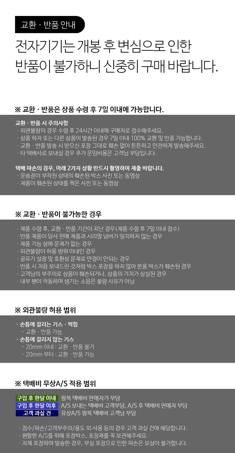 - ㆍ제조사의 사정 (신모델 출시 등) 및 부품 가격 변동 등에 의해 무료 교환/반품으로 요청하는 경우