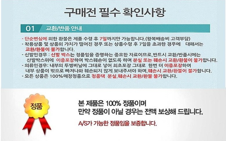 - ㆍ교환/반품에 관한 일반적인 사항은 판매자가 제시사항보다 관계법령이 우선합니다.