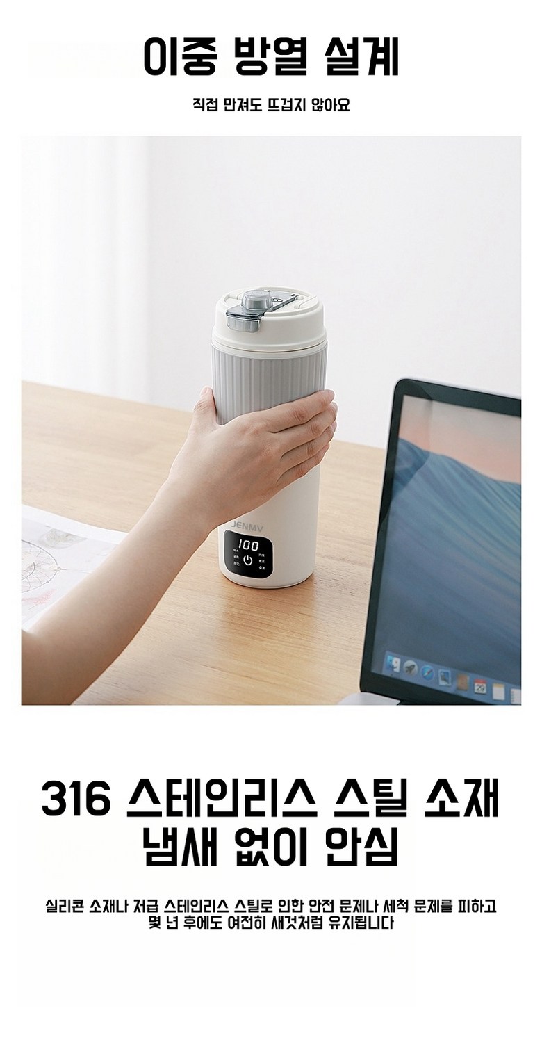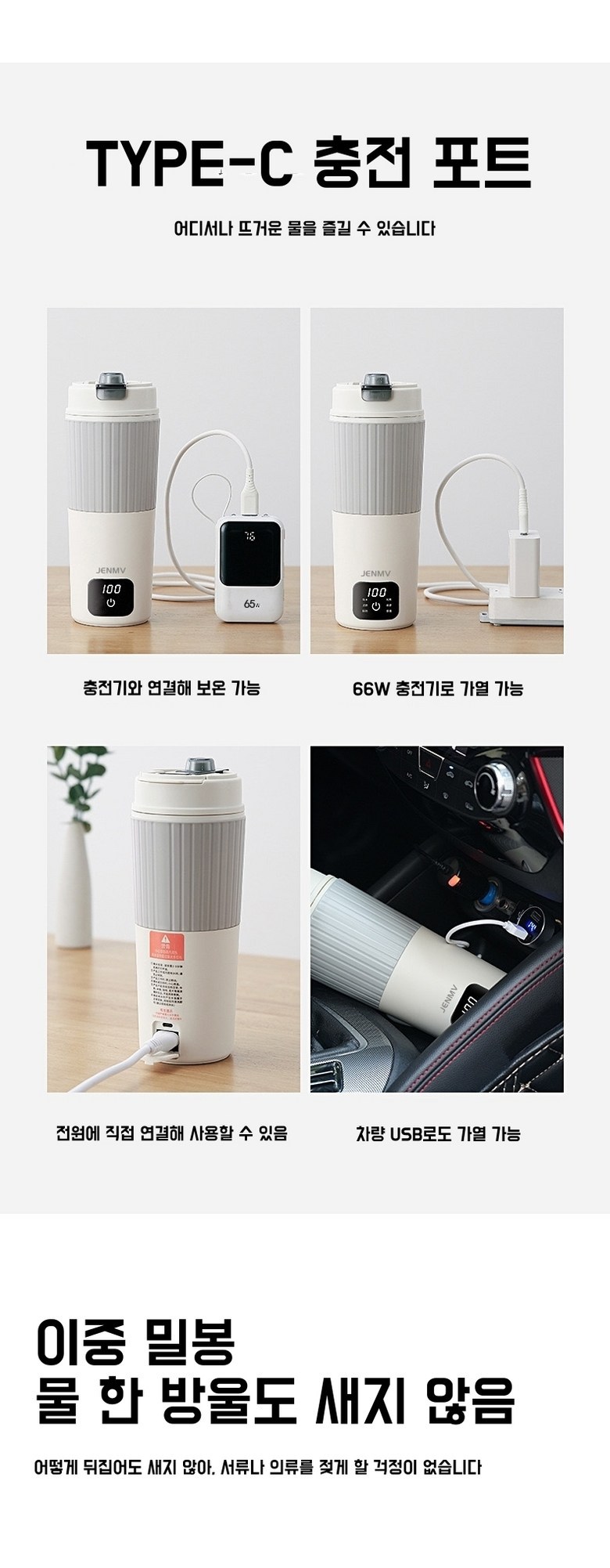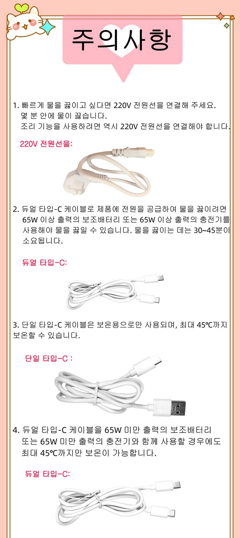 - Type-c로 사용하시면 물을 끓이는 기능만 있습니다. 저전력은 보온만 가능하며 온도를 약 45°C로 유지할 수 있습니다. 제품은 물을 끓이는 데 사용되기 때문에 전력이 필요하므로 Type-c로 물을 끓이려면 65w 또는 65w 이상의 충전기나 보조배터리를 연결해야 물을 끓일 수 있습니다.