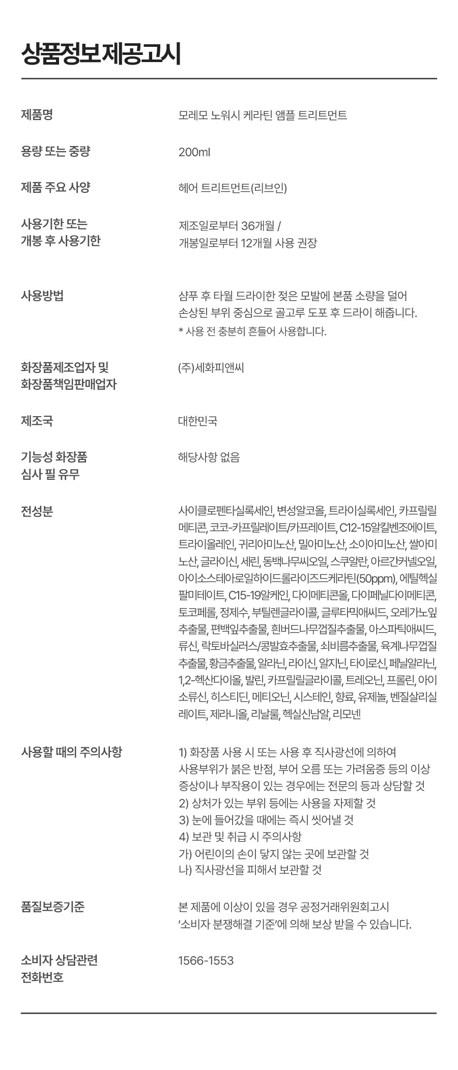 | 용량(중량) | 200ml | 제품 주요 사양 | 모든 모발용 |
