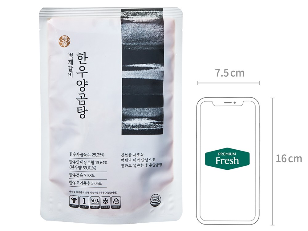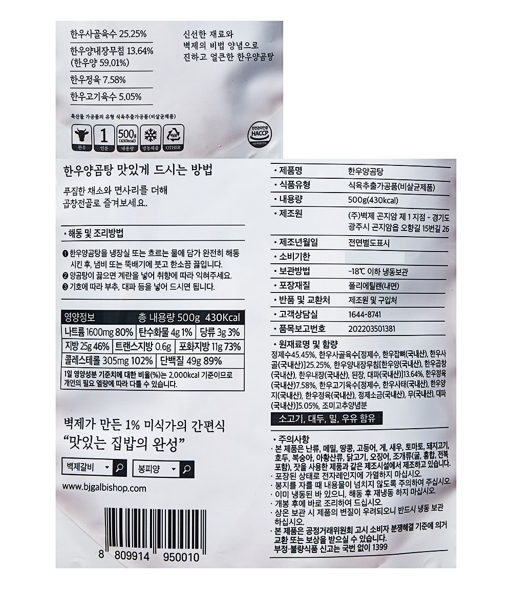 1986년 개업 이래 전통 한우 요리 명가로 꾸준히 사랑받는 벽제갈비의 한우 양곰탕입니다. 얼큰하고 개운한 국물에서 숙련된 장인들의 시간과 정성이 고스란히 느껴지죠. 한우 고기 육수와 한우 사골 육수를 12시간 동안 정성을 다해 우려내 국물의 깊은 맛이 일품이랍니다. 한우 곱창, 양이 듬뿍 들어가 씹는 맛도 좋으니, 간편하게 조리해 특별한 한 끼 식사를 즐겨보세요.