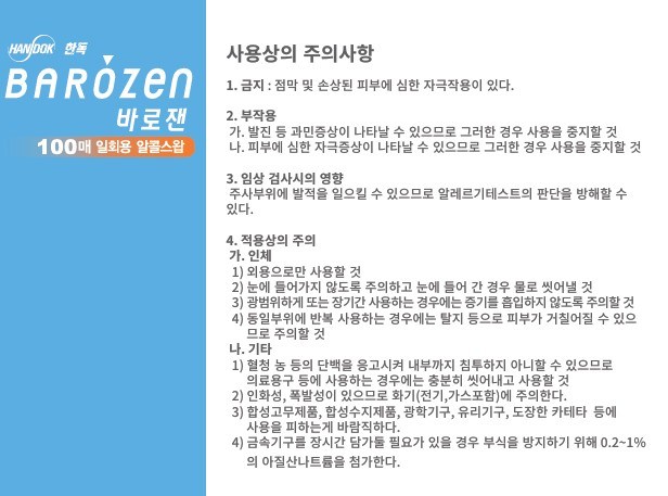 | 품명 및 모델명 | 바로잰알콜스왑(에탄올) | 인증/허가 사항 | 의약외품 |