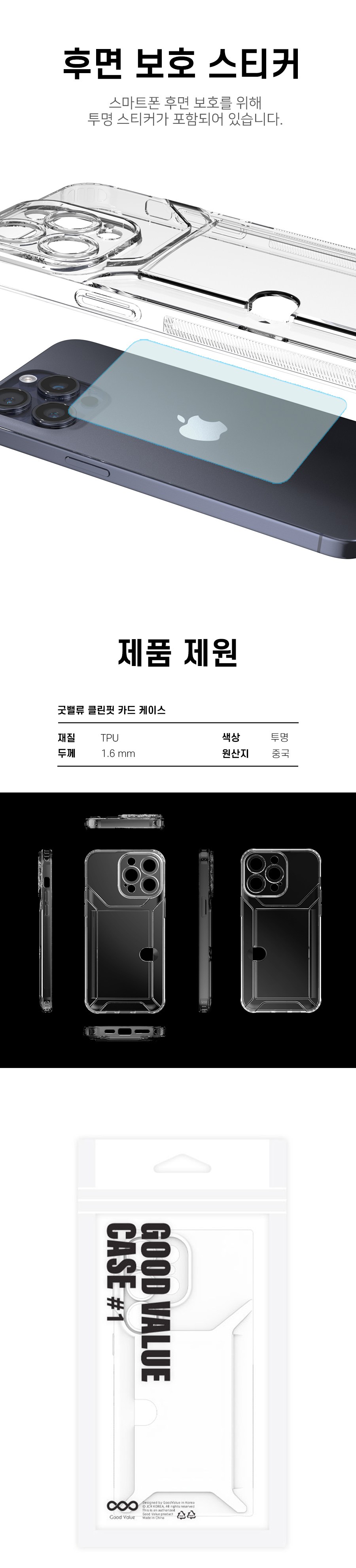 | 품명 및 모델명 | 굿밸류 클린핏 카메라보호 2장 카드 휴대폰 케이스 투명 갤럭시S26 | 인증/허가 사항 | 해당없음 |