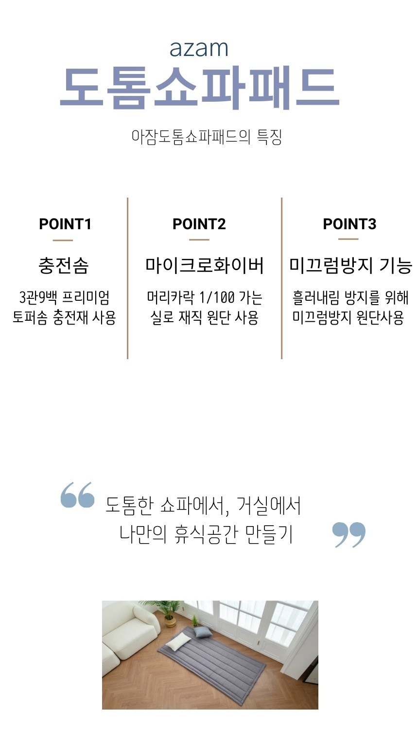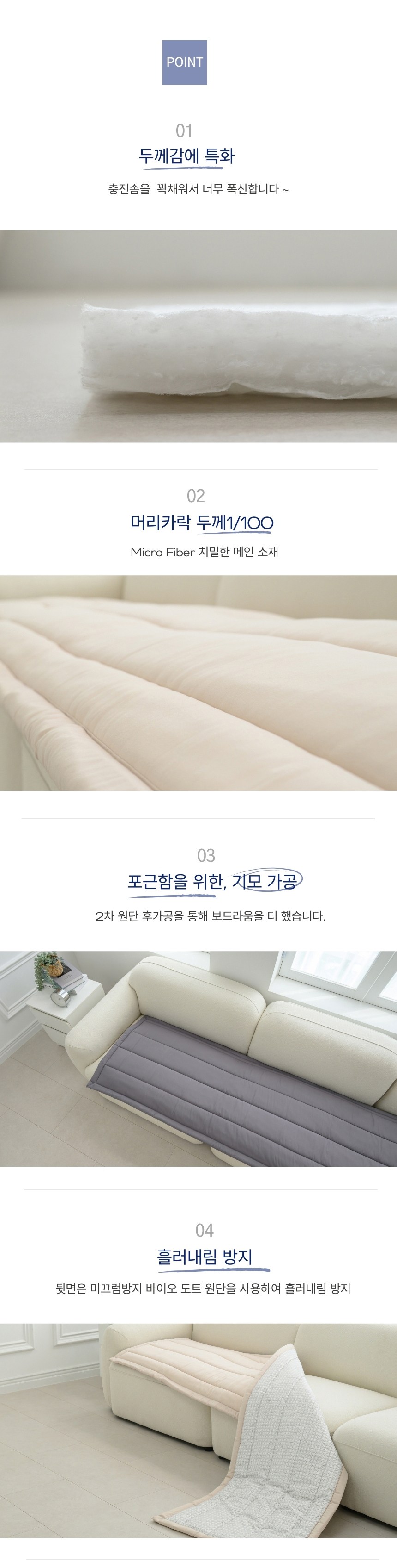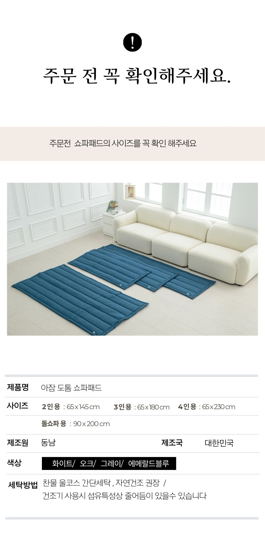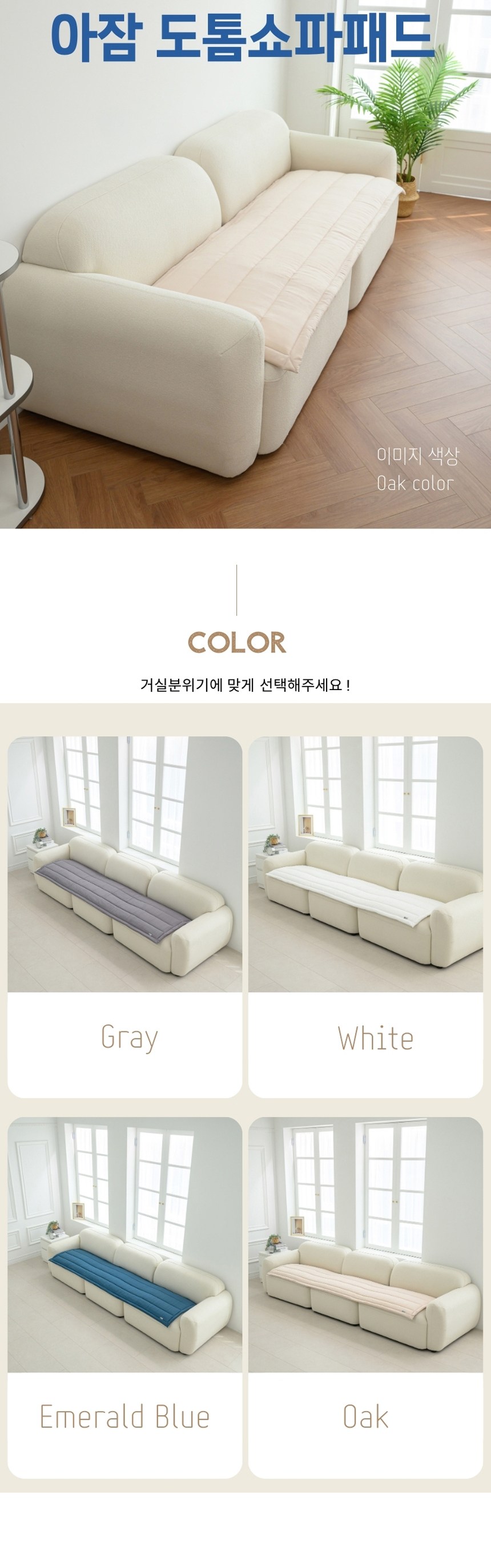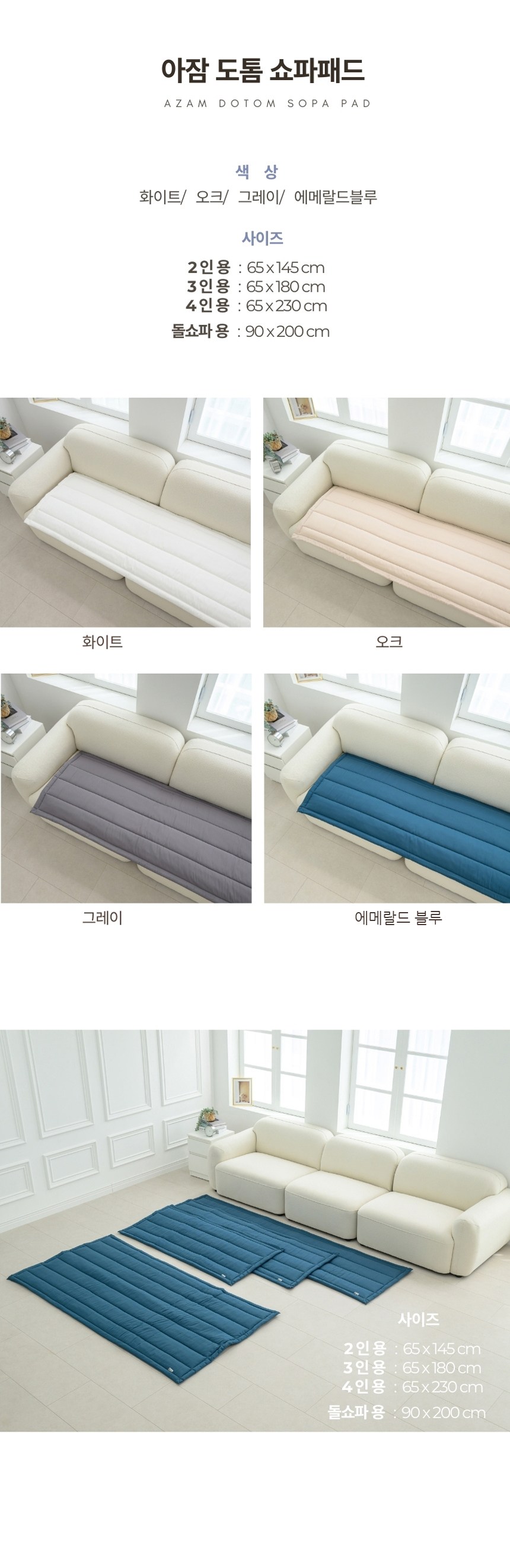 | 제품 소재 | 소재 : 마이크로화이버(PE 100%) / 충전재 : 쇼파패드 전용 충전솜(정확한 혼용률 업체미제공) | 색상 | 컨텐츠참조 |