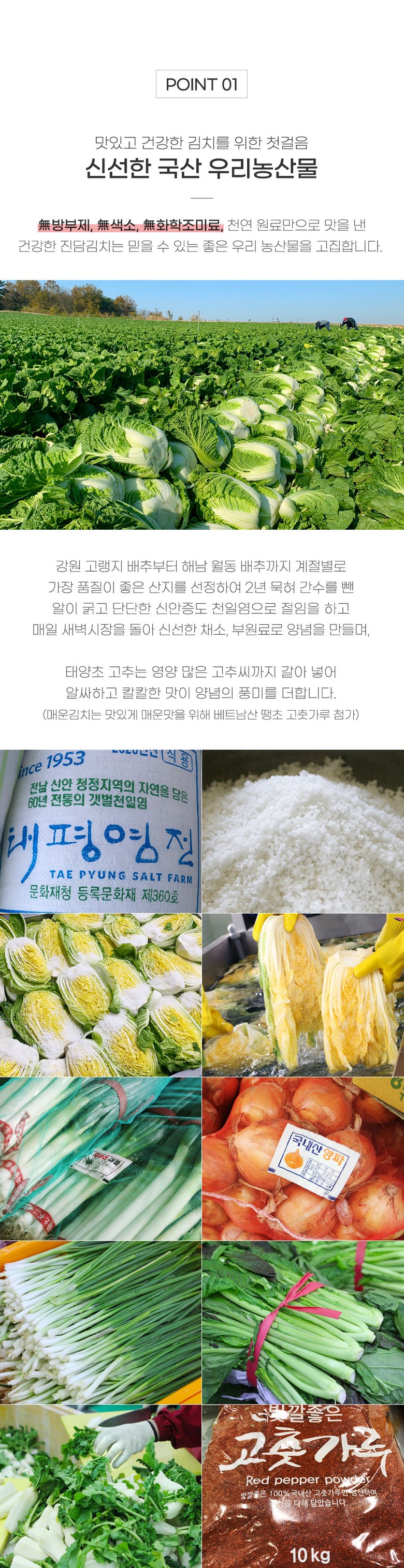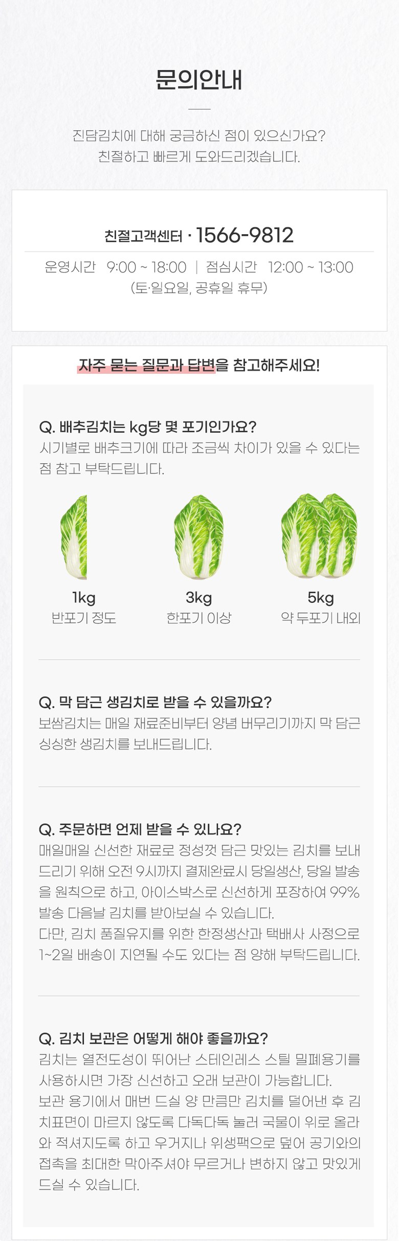 | 포장단위별 내용물의 용량(중량), 수량 | 1kg, 3kg, 5kg | 원재료명 및 함량 | 절임배추71%[배추98%(국산),천일염(국산)],다시마육수(국산),고춧가루(국산),무(국산),찹쌀풀(국산),멸치젓(국산),새우젓(국산),양파(국산),마늘(국산),멸치액젓(국산),무말랭이(국산),설탕,물엿,쪽파(국산),건고추(국산),밤다이스(국산),까나리액젓(국산),사과(국산),부추(국산),배(국산),황석어젓(국산),청각(국산),생강(국산),대파(국산) |