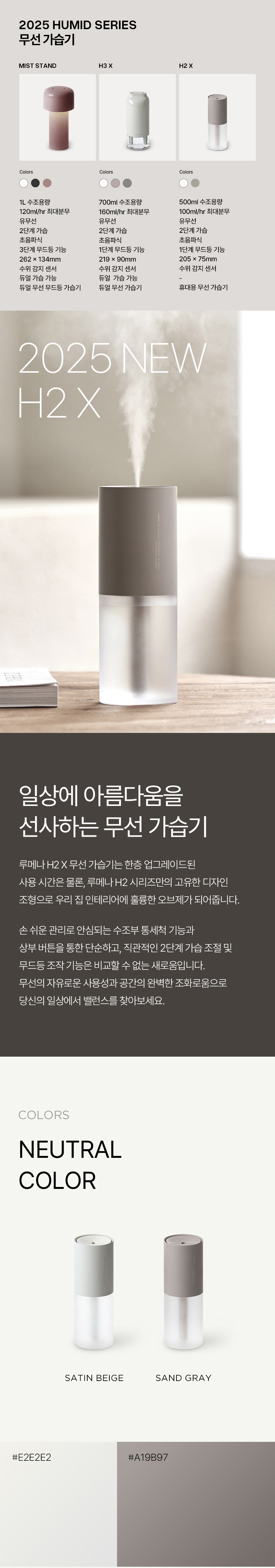 | 품명 및 모델명 | 루메나 무선 미니가습기 H2 X / H2 X | KC 인증정보 | 본품: R-R-ONH-H2PLUS 전지: XU100557-22027A |