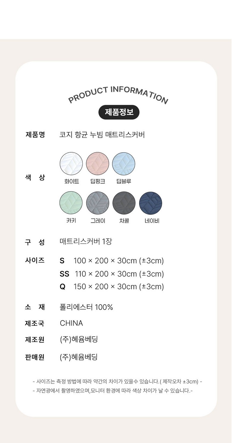| 제조자(수입자) | 주식회사 혜윰베딩 | 제조국 | 중국 |