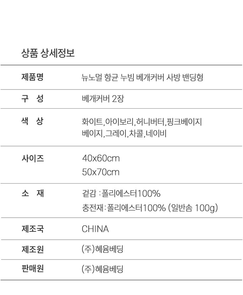 | 제조자(수입자) | (주)혜윰베딩 | 제조국 | 중국 |