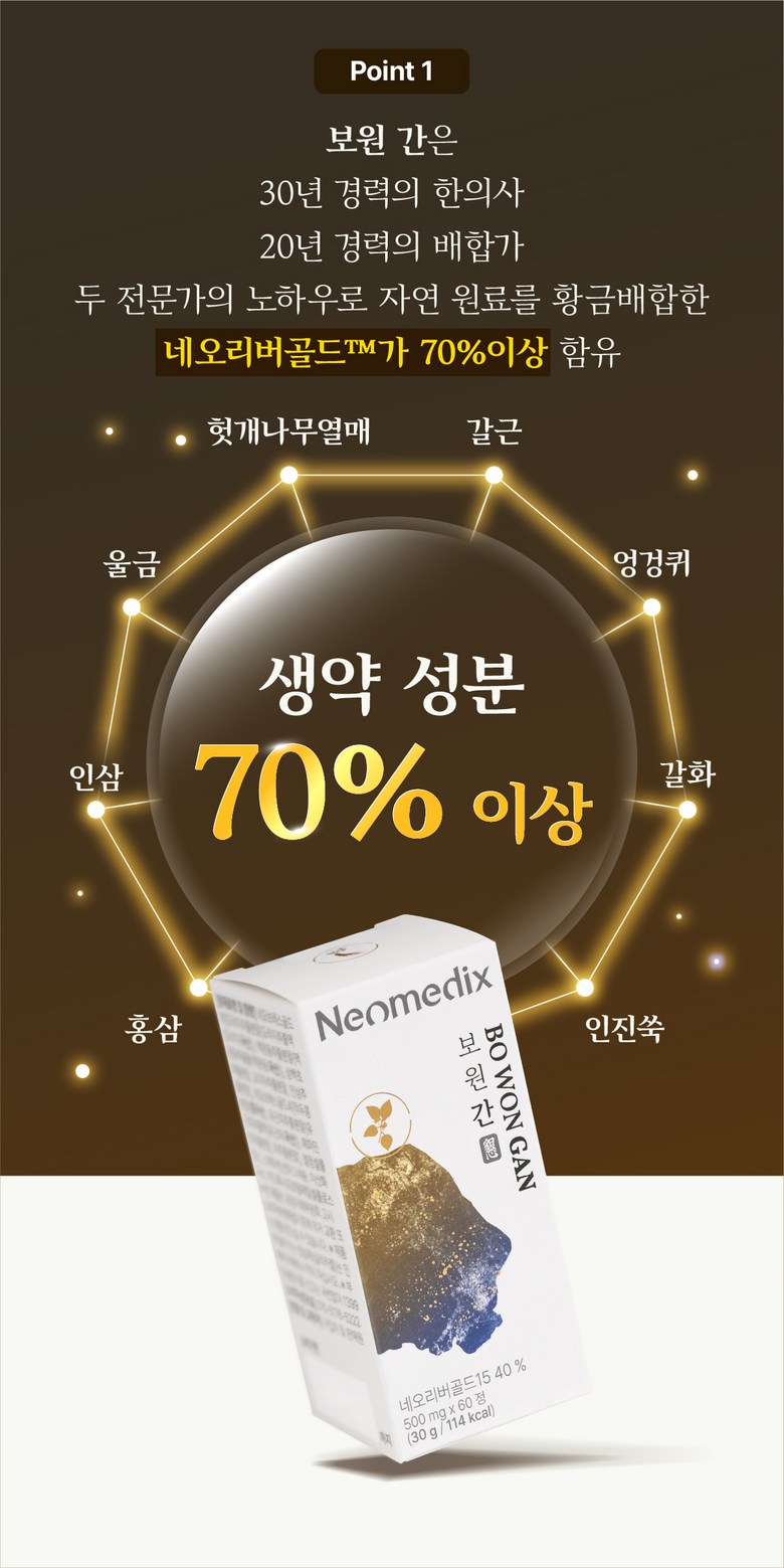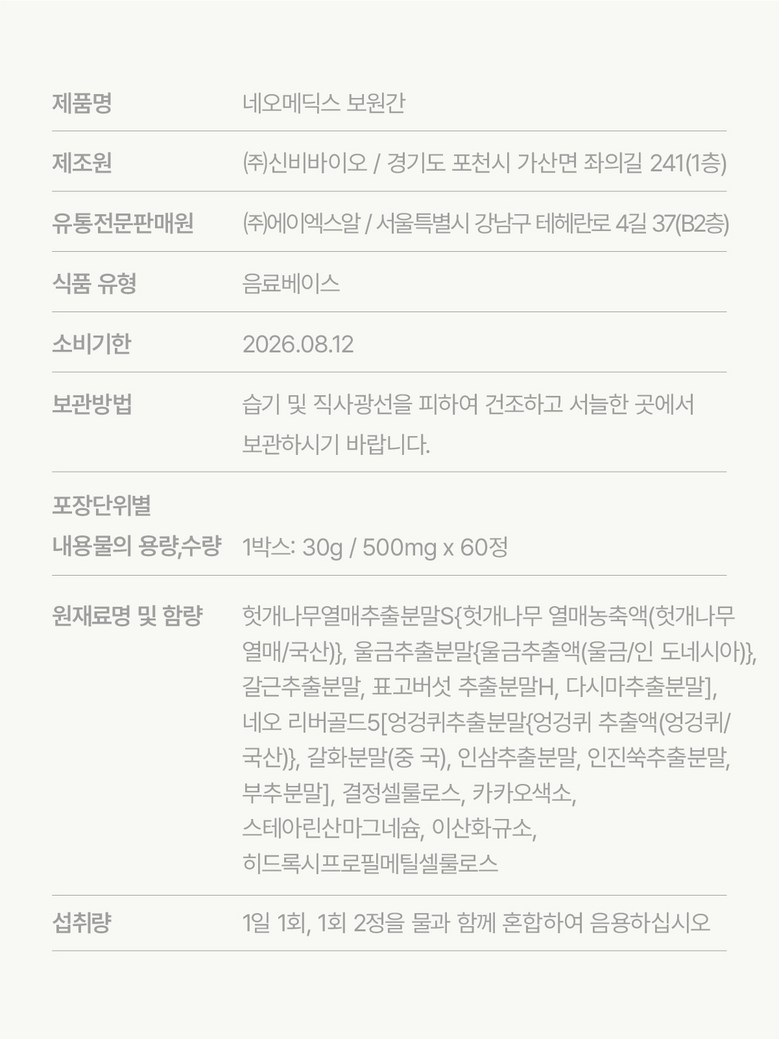 | 포장단위별 내용물의 용량(중량), 수량 | 1정 500mg / 총 60정(30g) 1박스 | 원재료명 및 함량 | 헛개나무추출분말, 울금추출분말, 갈근추출분말, 표고버섯추출분말, 다시마추출분말, 네오리버골드, 갈화분말, 인삼추출분말, 인진쑥추출분말, 결정셀룰로스, 카카오색소, 스테아린산마그네슘, 이산화규소, 히드록시프로필메틸셀룰로스 |