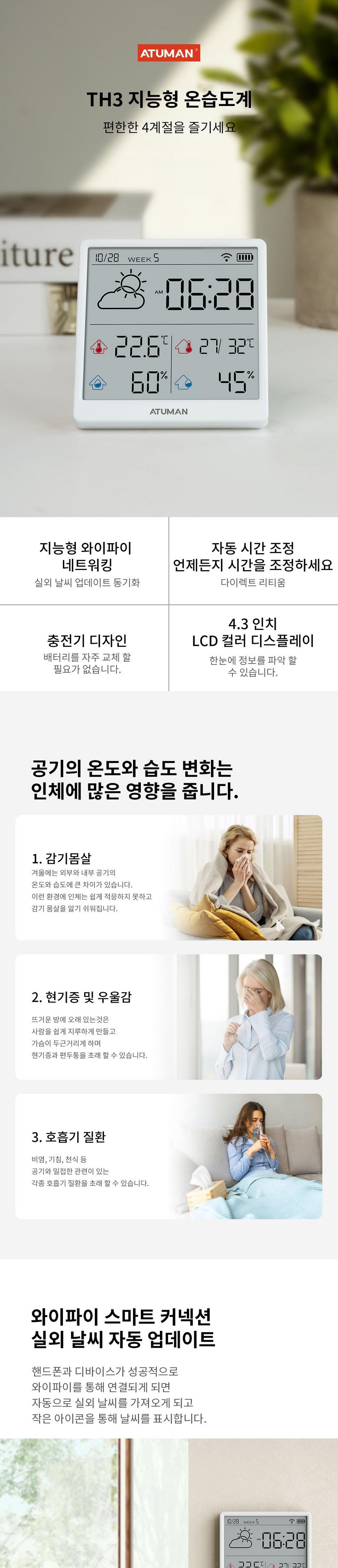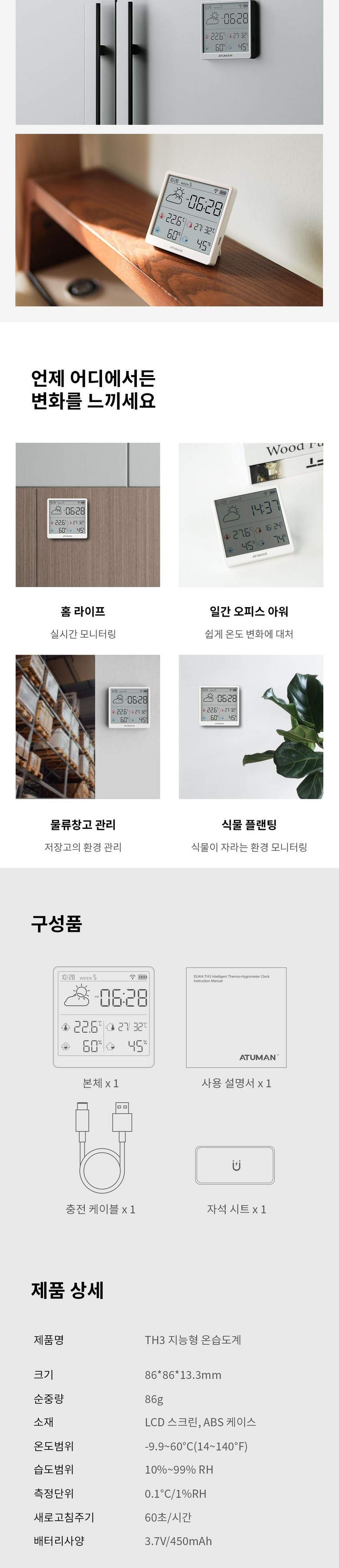아투맨 TH3 스마트 온습도 시계, 화이트, 1개