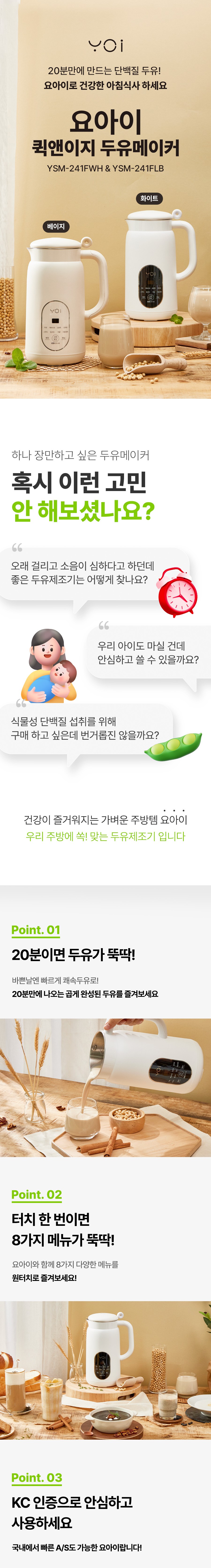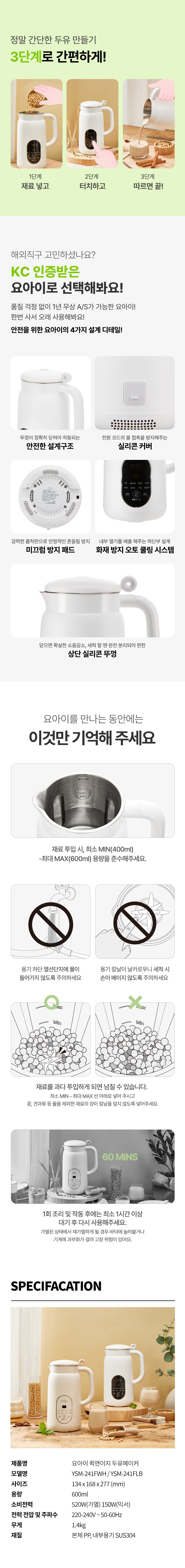 | 품명 및 모델명 | Soymilk maker / YSM-241FLB | KC 인증정보 | SU073035-24001, R-R-JyC-DJ06X-D525 |