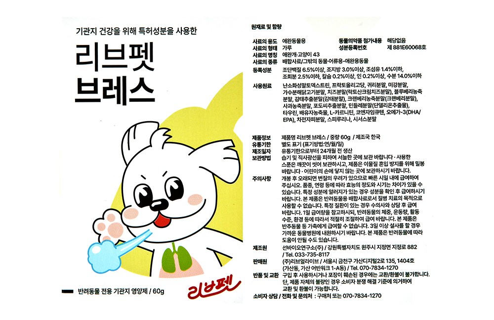 | 품명 및 모델명 | 리브펫 브레스 | 인증/허가 사항 | 사료관리법에 따른 성분등록번호 : 컨텐츠 참조 |
