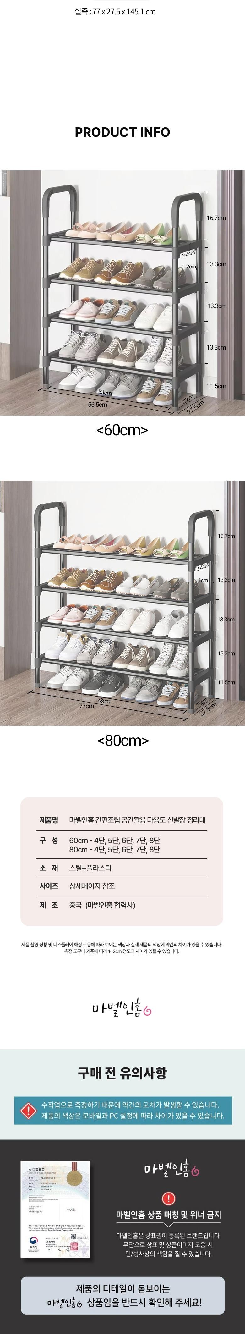 | 품명 및 모델명 | 마벨인홈 간편조립 공간활용 다용도 신발장 정리대 60cm | 인증/허가 사항 | 상품 상세페이지 참조 |