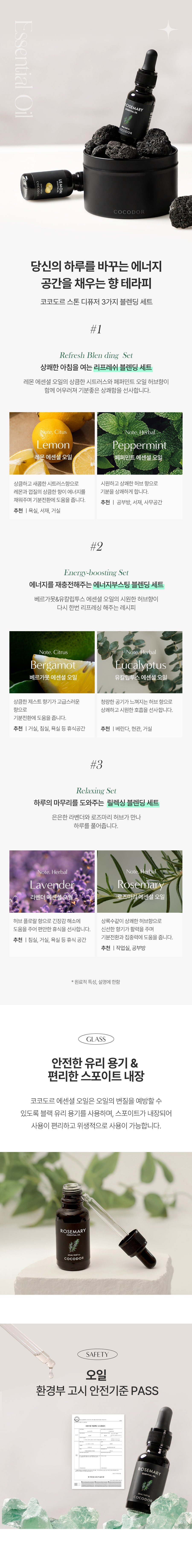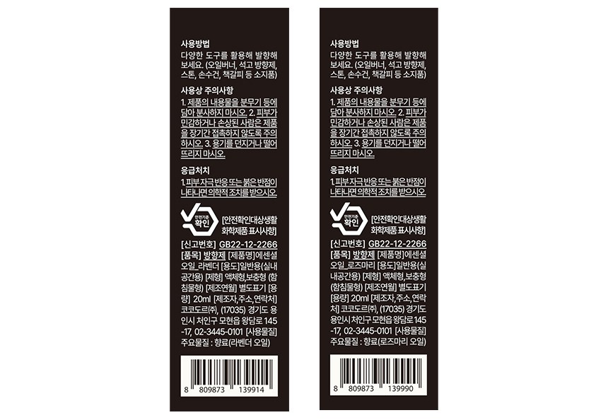 | 품목 및 제품명 | 방향제 / 에센셜오일_라벤더, 에센셜오일_로즈마리 | 용도(표백제의 경우 계열을 함께표시) 및 제형 | 일반용(실내공간용) / 액체형, 보충형(함침물형) |