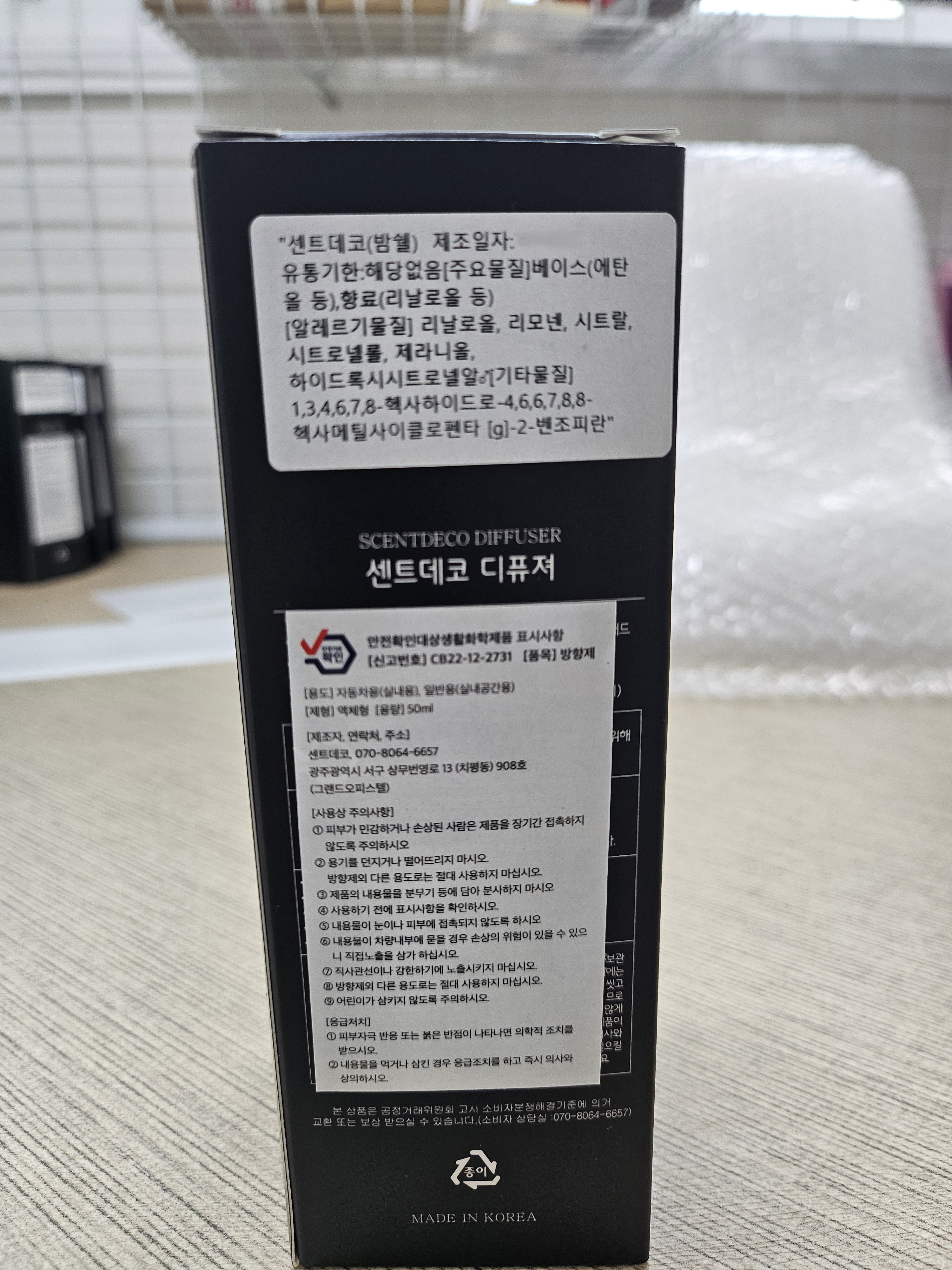 | 품목 및 제품명 | 방향제 /센트데코(밤쉘) | 용도(표백제의 경우 계열을 함께표시) 및 제형 | 자동차용(실내용),일반용(실내공간용) / 액체형 |
