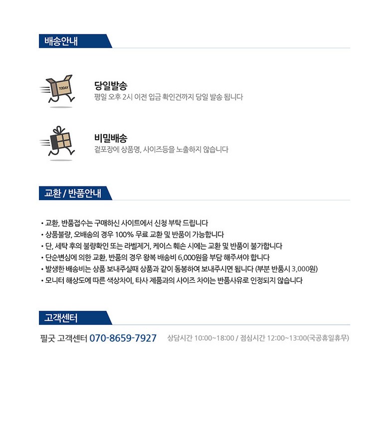 - ㆍ모니터 해상도의 차이로 인해 색상이나 이미지가 실제와 달라, 고객이 단순 변심으로 교환/반품을 무료로 요청하는 경우