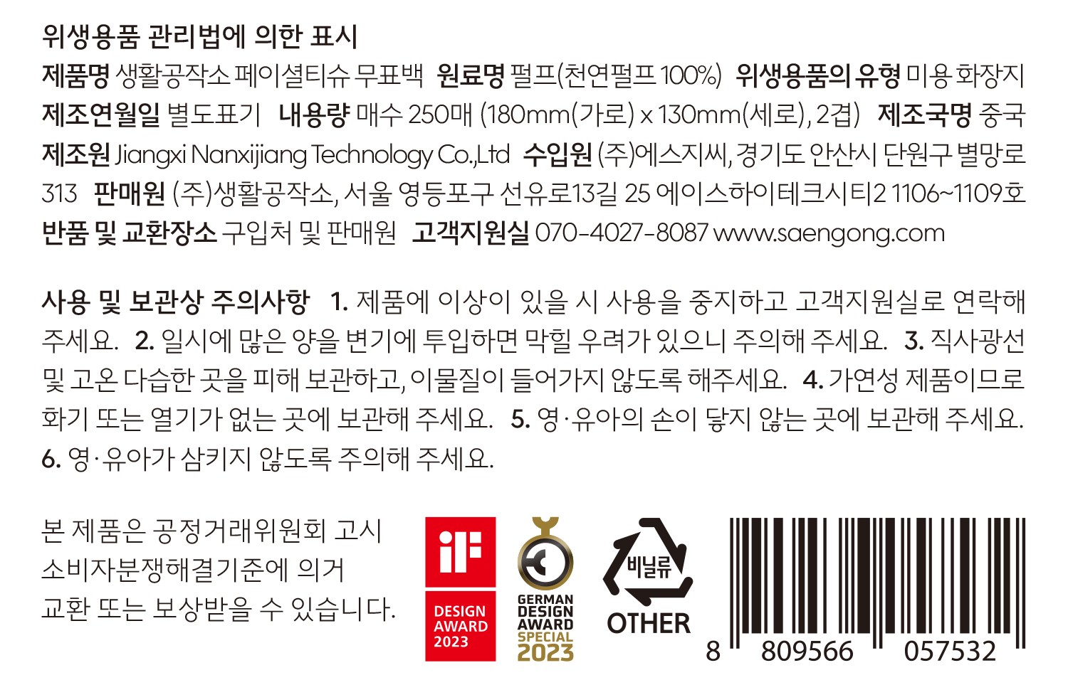 | 품명 및 모델명 | 생활공작소 페이셜 티슈 무표백 | 인증/허가 사항 | 위생용품 |