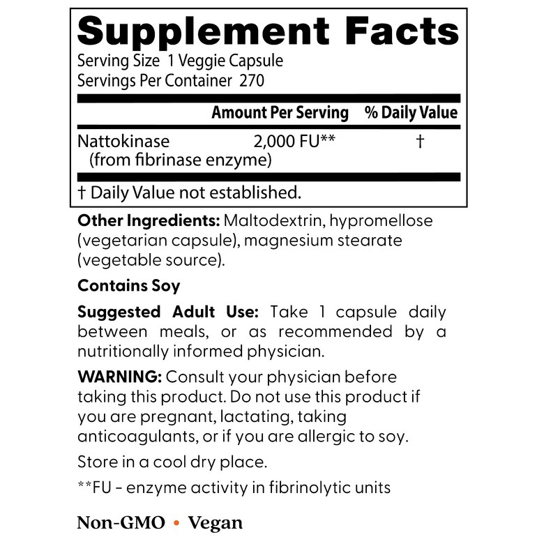 Nattokinase(나토키나아제)가 함유된 식이 보조제입니다. 1인분 당 Nattokinase 2,000FU를 제공합니다. 말토덱스트린, 스테아린산 마그네슘 등이 함유되어 있습니다.